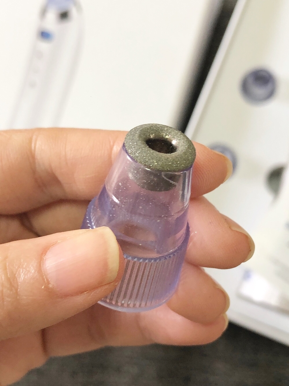 หัวที่ 3 ตัวนี้จะเป็นหัวสำหรับกรอผิวหน้าเป็น Microcrystalline หรือหัวกรอเพชร จะช่วยผลัดเซลล์ที่ตายแล้วออกมานั่นเอง ช่วยลดความหมองคล้ำที่สะสมอยู่บนหน้า ให้กระจ่างเนียนใสทั่วทั้งใบหน้าจ้า