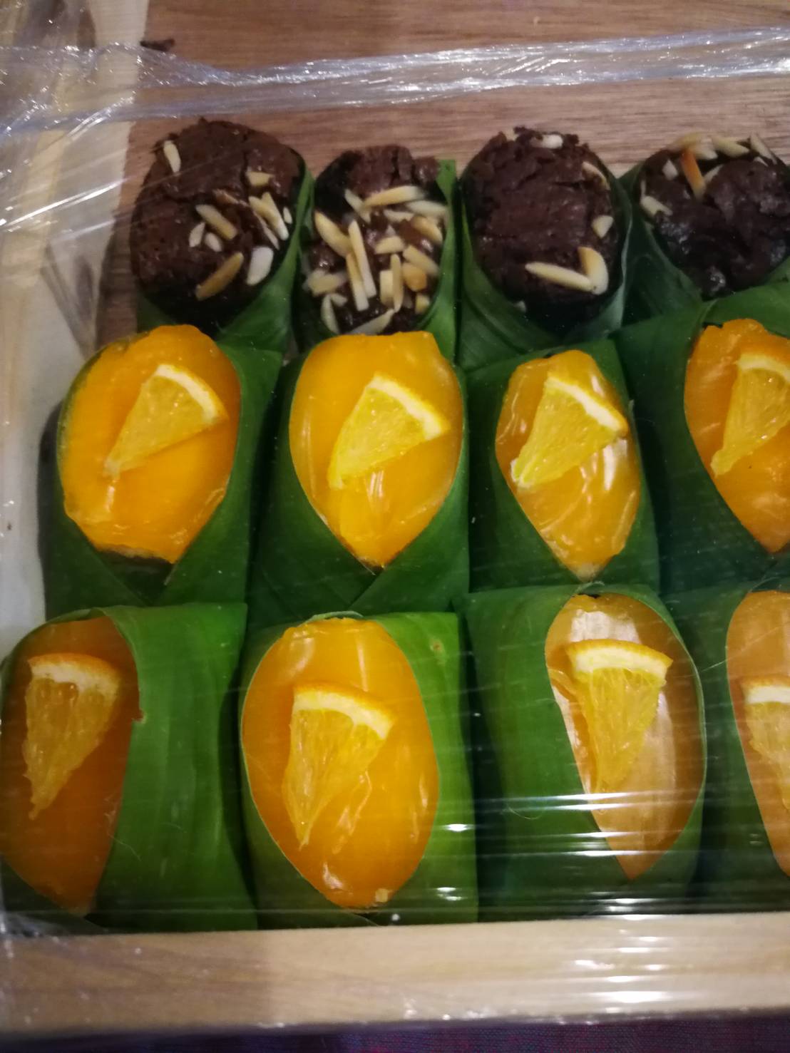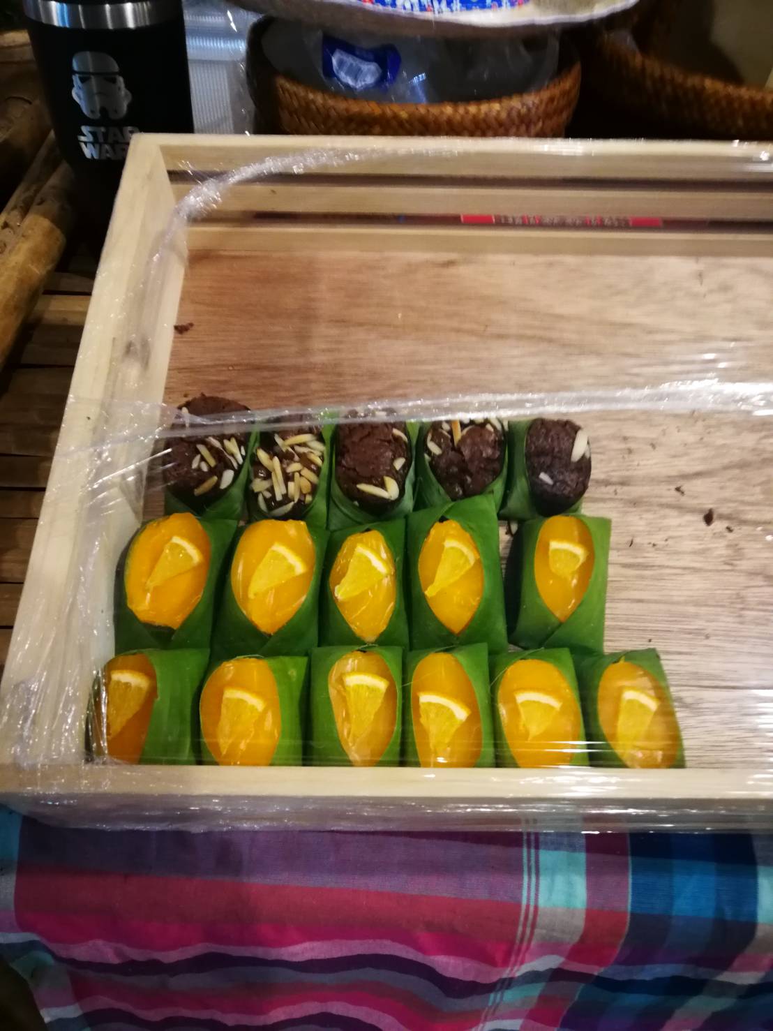 ขยับมาอีกนิด ผมติดใจ แพคเกจของขนมเค้กที่นี่ เป็นการกลมกลืนที่กลมกล่อมมาก เขาเอาใบตองมาห่อขนมเค้ก
