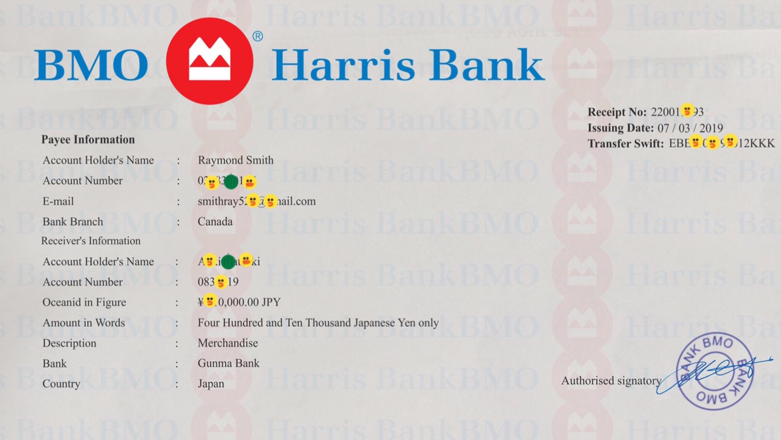 เนื่องจากสามีเราโพสขายจักรยานยนต์มือสองในเว็บไซต์นึงของญี่ปุ่น (เราอาศัยอยู่ในประเทศญี่ปุ่น) แล้วมีชายคนหนึ่งที่เป็นชาวแคนนาดาสนใจ แล้วตกลงซื้อขายกับสามีเราผ่านทาง email และทาง Line แต่ตามที่ชายคนดังกล่าวแจ้งเงื่อนไขว่าเราต้องโอนค่าขนส่งทางเรือไปให้บริษัทขนส่งก่อน (ซึ่งบริษัทขนส่งอยู่ประเทศ Benin Republic ในทวีปแอฟริกาเพราะเขาต้องการส่งไปที่นั่น) แล้วให้เราถ่ายใบสลิปค่าโอนนั้น Email แจ้งธนาคาร BMO ธนาคารจะอนุมัติยอดเงินที่ชายคนนี้ส่งให้เรา ซึ่งสามีกับเราก็เกรงว่าจะโดนหลอก จึงแจ้งกับเขาว่าเราไม่สามารถโอนเงินให้บริษัทขนส่งก่อนที่เราจะได้รับเงินจากเขาได้ เขาจึงส่งหลักฐานการโอนเงินของเขาที่จะให้เราผ่านธนาคาร BMO มาให้เราค่ะ