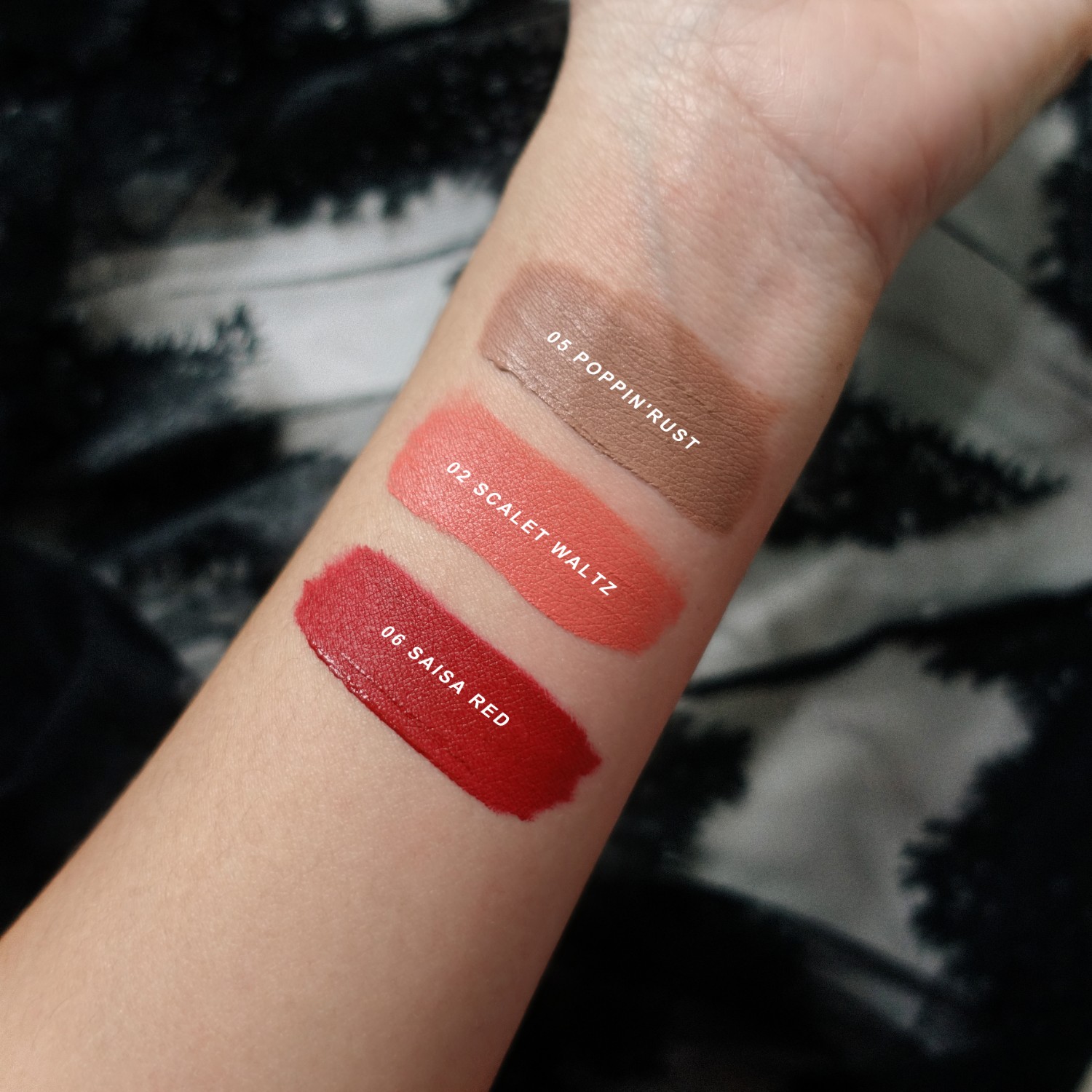 GENIE G รุ่น DANCING GENIE COLLECTION (แท่งละ 390 เราซื้อมาตอนลดพอดี 290 บาท ) เป็นลิปแมทจิ้มจุ่ม เม็ดสีชัด เนื้อแมทแห้งสนิทแต่ยังรู้สึกสบายปาก ไม่หนักปาก กลบสีปากได้มิด แต่วันนี้เราหยิบมารีวิวด้วยกัน 3 สี ได้แก่ 02 SCALET WALTZ, 05 POPPIN’RUST และ 06 SAISA RED