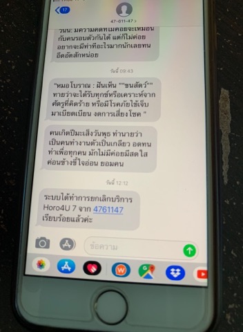 ซิมรายเดือนที่ได้มาจากเน็ตบ้านของทรูใช้มาสักพักประมาณ 1 เดือน พอวันนี้มีข้อความเกี่ยวกับดูดวงเข้ามา เลยเข้าไปดูปรากฎว่ามีข้อความขอบคุณที่สมัครบริการ Horo4U7 เลยรีบโทรไปที่ 1242 พอโทรถามเรื่อง SMS ยังไม่ทันอะไรก็มีข้อความยกเลิกเข้ามาทันที (ยังไม่ได้แจ้งยกเลิกแต่กยกเลิกให้ก่อนเลย)