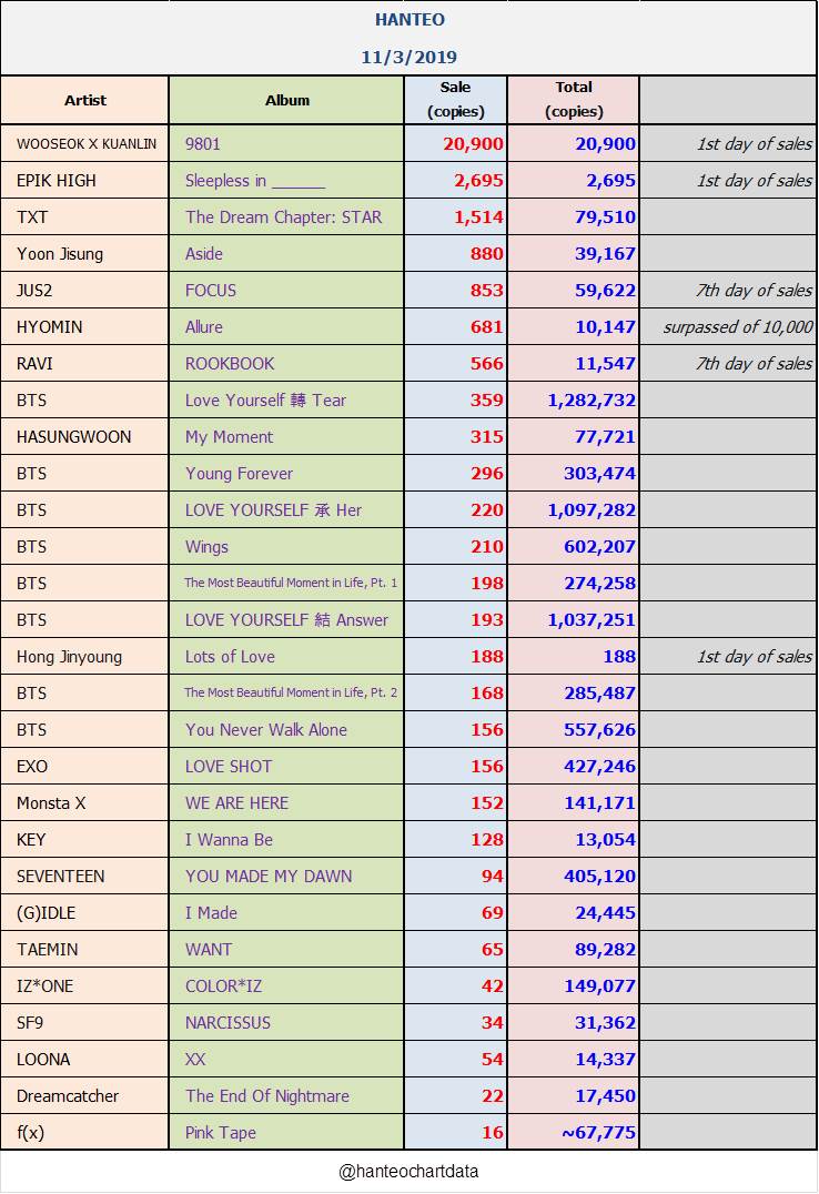 ยอดซื้ออัลบั้มจากชาร์ต HANTEO 11 มีนาคม 2562