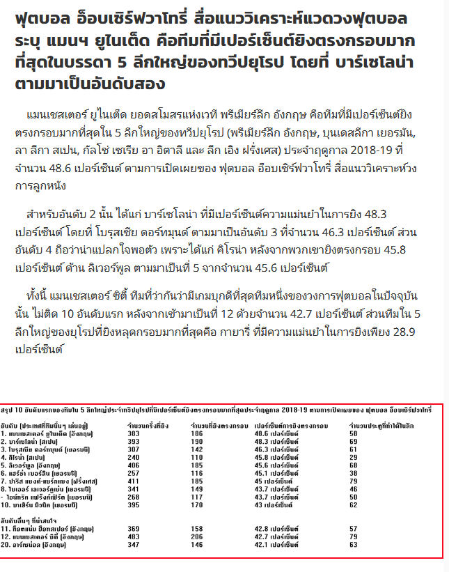 สื่อนอกเกี่ยวกับสถิติระบุชี้ชัดว่า มานอู คือทีมที่ยิงตรงกรอบมากที่สุดในยุโรปเหนือ บาร์เซโลน่า บาเยิร์น มิวนิค เรอัล มาดริด