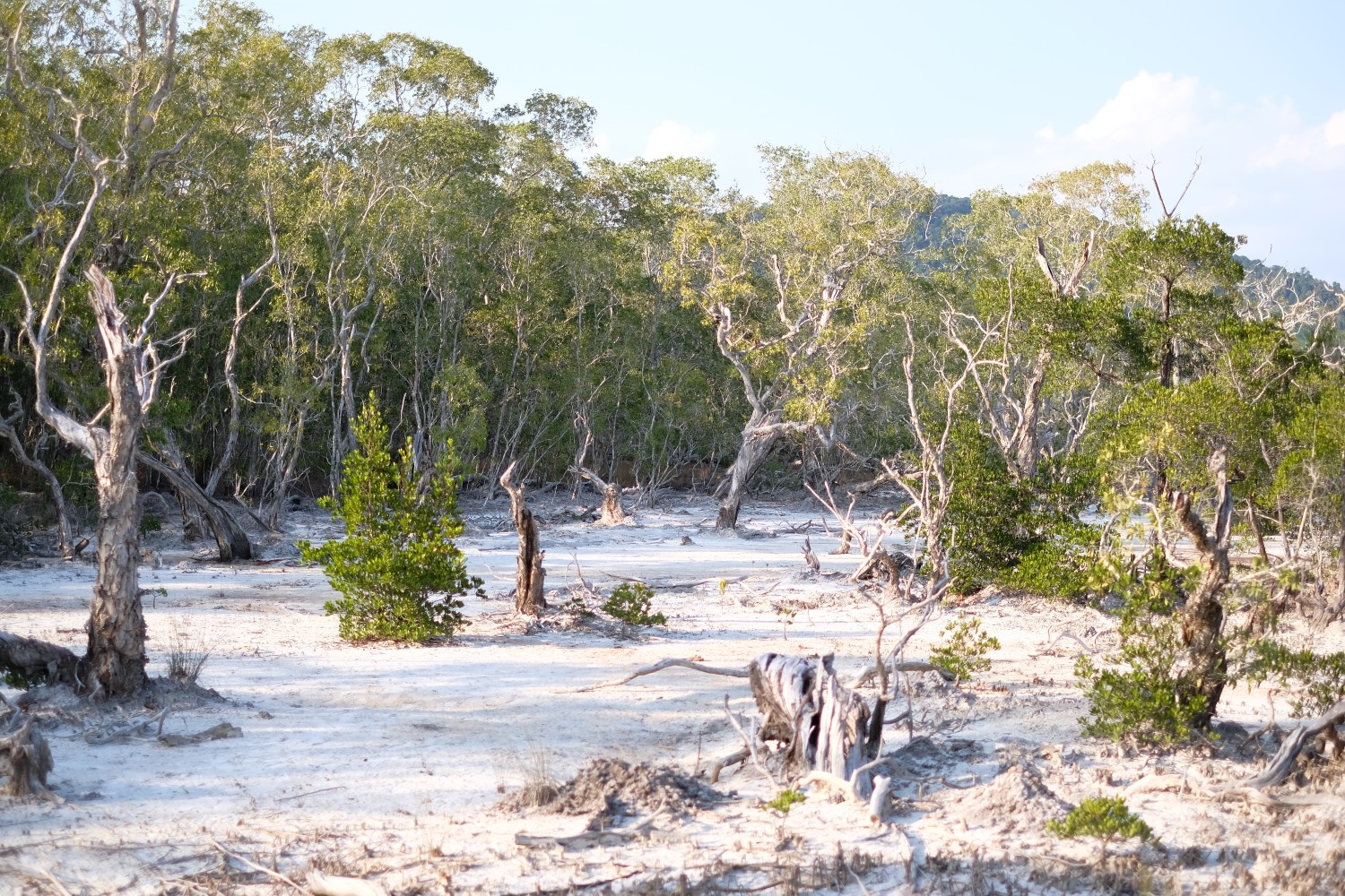 พื้นทรายขาว ละเอียดเป็นเม็ดแป้ง สลับกับมีต้นไม้เขียวๆเป็นแบลคกราว ดีงามไปอีก