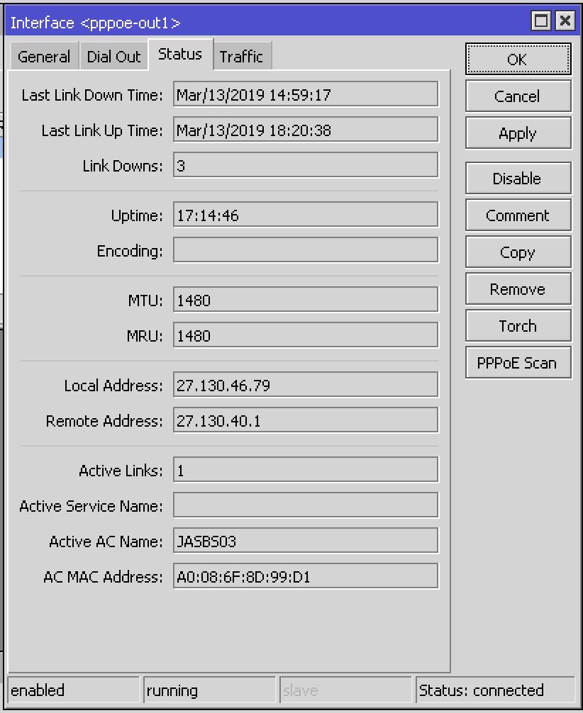 เมื่อวาน หายไปจาก บ่าย 3 ใช้งานได้อีกทีตอน 18:20น. มาเล่าให้ฟังเฉยๆ เพราะเมื่อวานก็ไม่ได้อยู่บ้าน แต่แฟนกลับมาบ้าน บ่าย 4 โมง บอกว่า Net ใช้ไม่ได้ ผมก็เข้า MikroTik จาก Internet ไม่ได้ (ปกติ 3BB ไม่ค่อยมีปัญหาสำหรับผม)