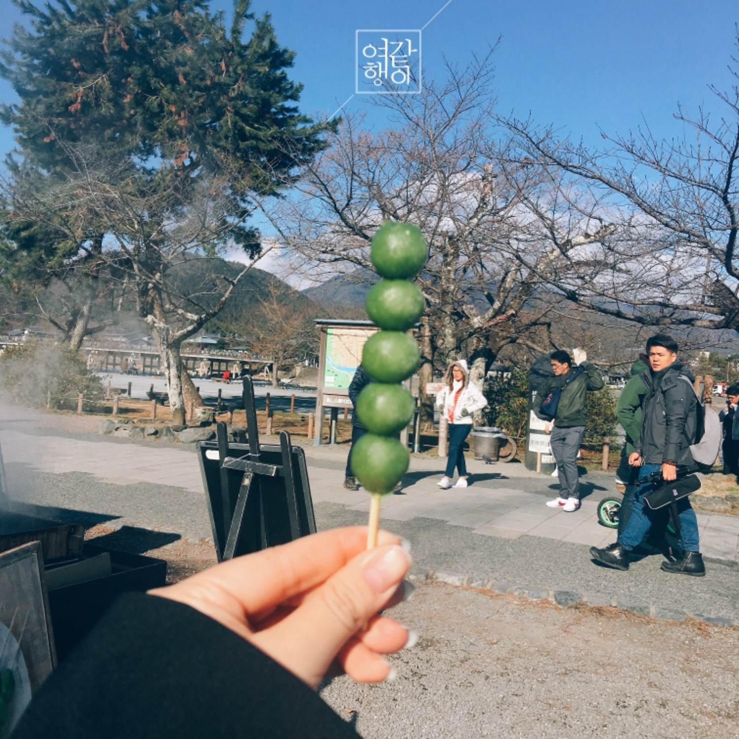 ข้างทางฝั่งที่เดินมาจากสถานีรถไฟจะมีขนมขายล่อตาล่อใจ เราก็เป็นคนที่อดใจไม่ไหว ลองสักหน่อย ได้เจ้านี้มา เขียวๆกลมๆ น่าจะเป็นดังโงะ