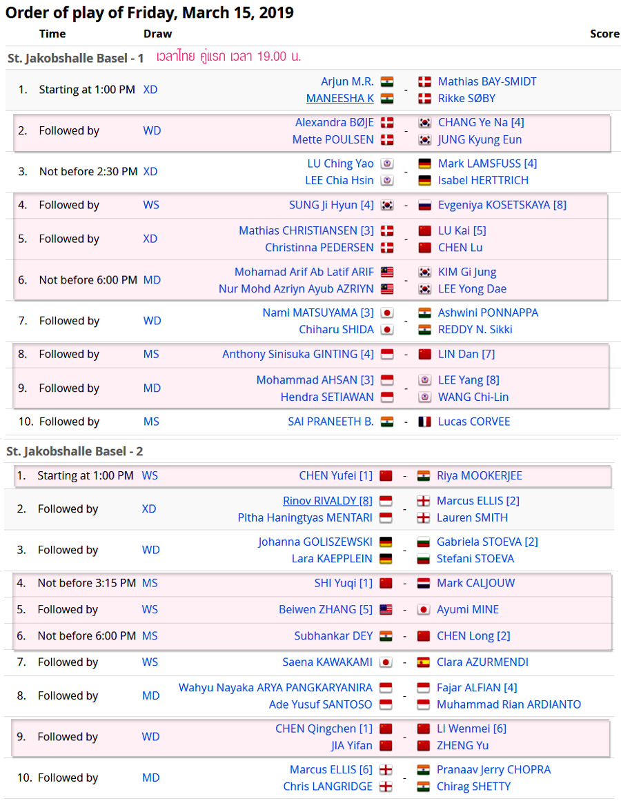 โปรแกรมการแข่งขัน แบดมินตัน YONEX Swiss Open 2019 & LINGSHUI CHINA MASTERS 2019 : รอบก่อนรองชนะเลิศ [15 มี.ค. 62]