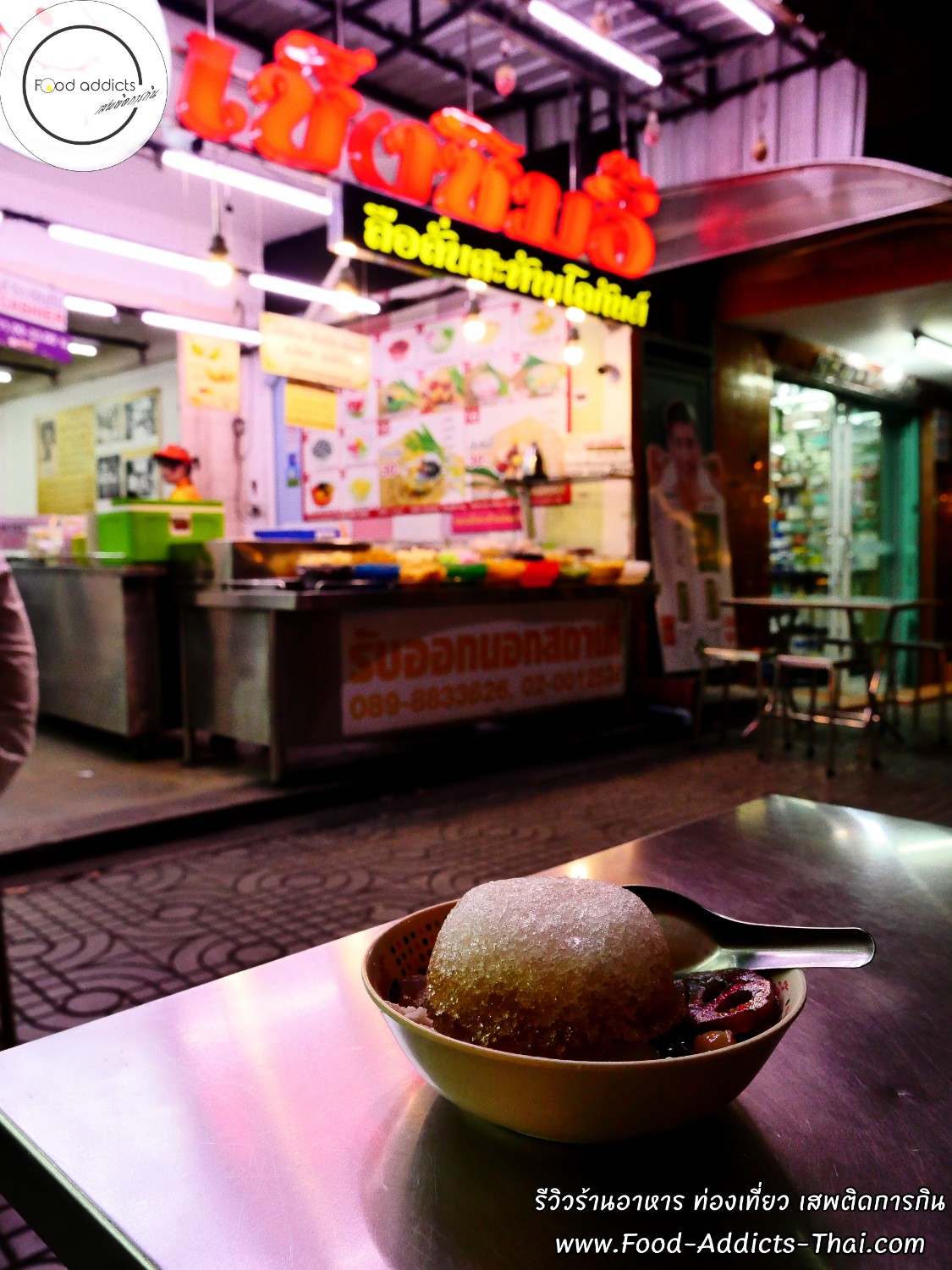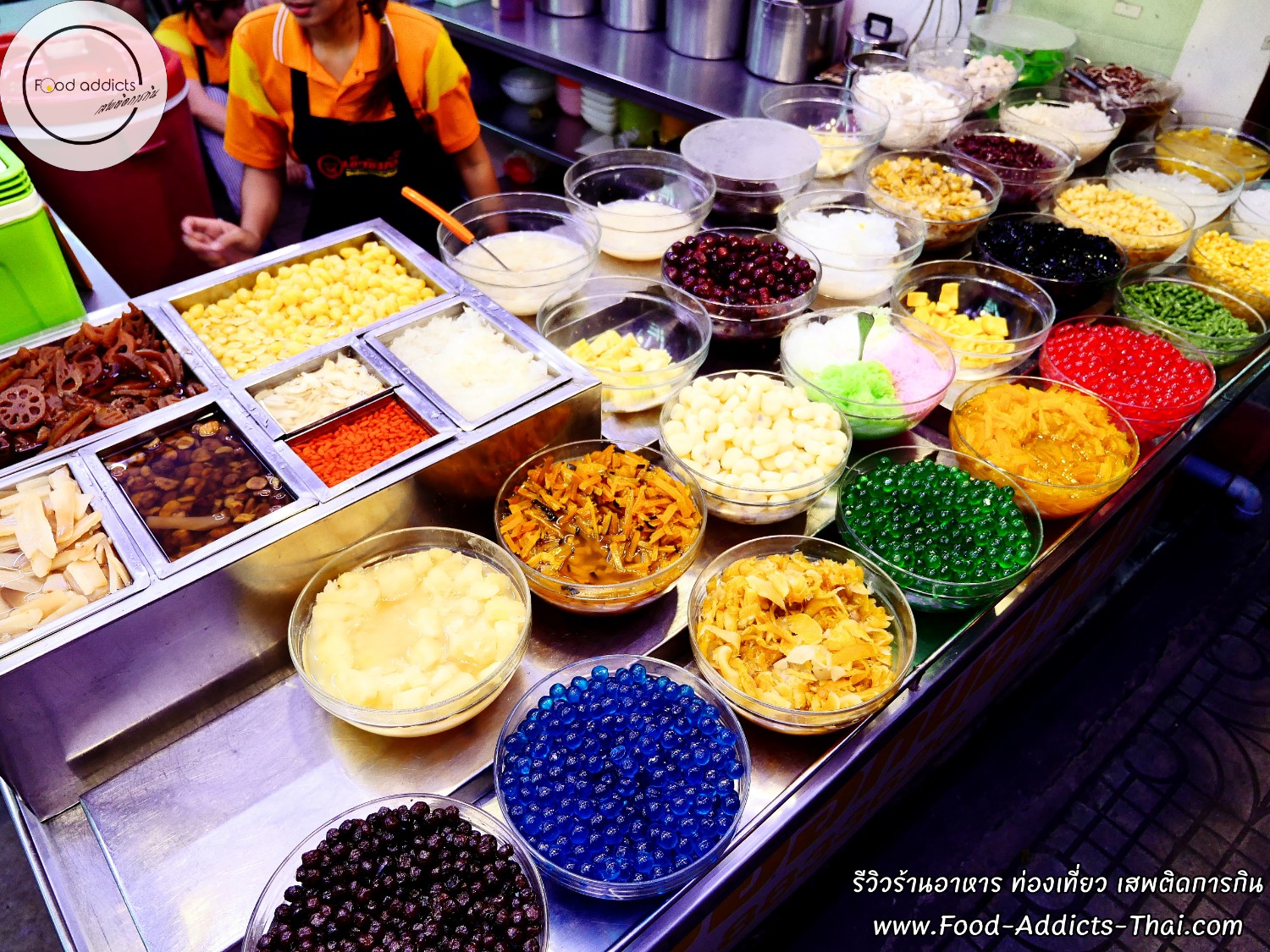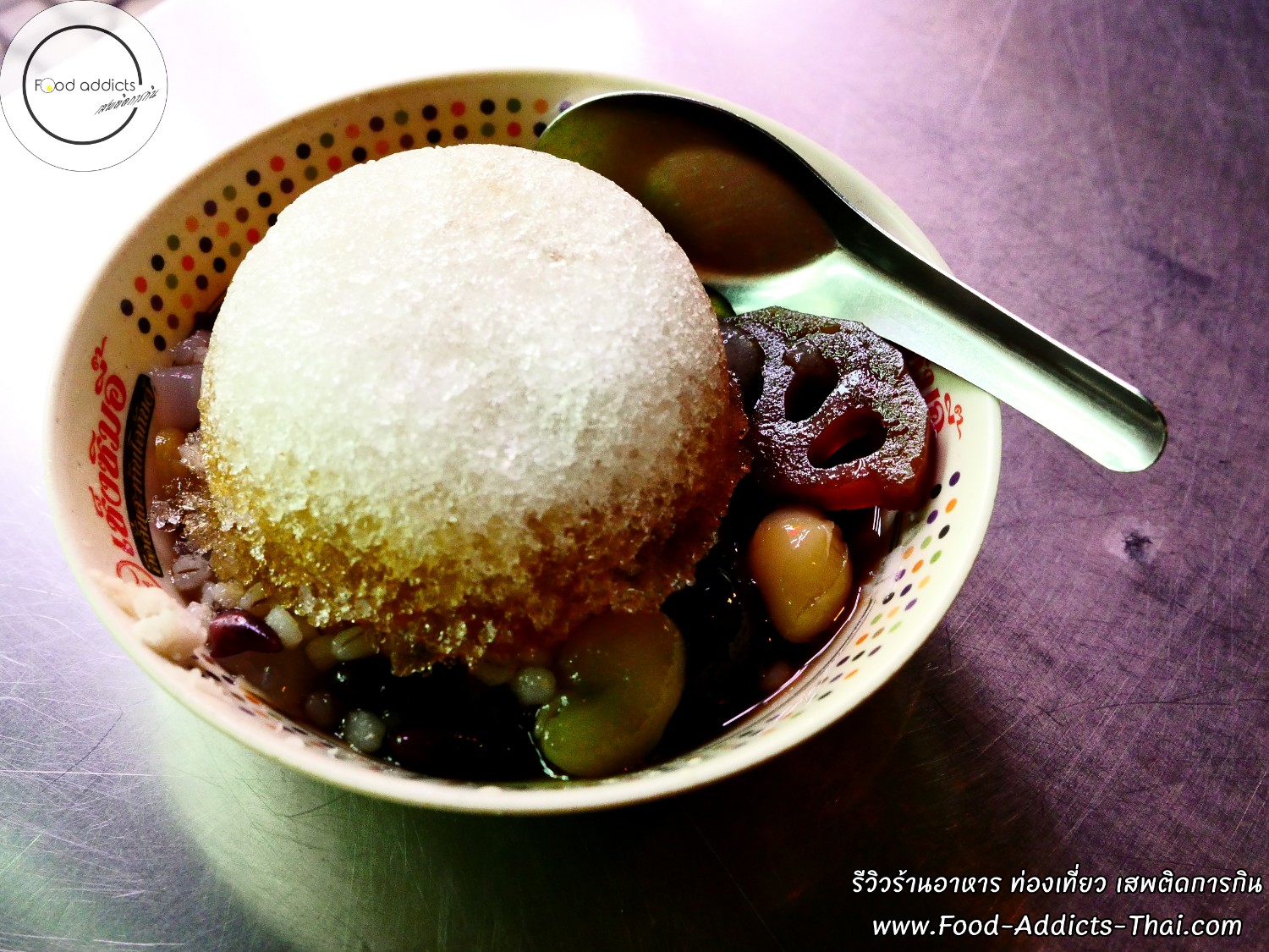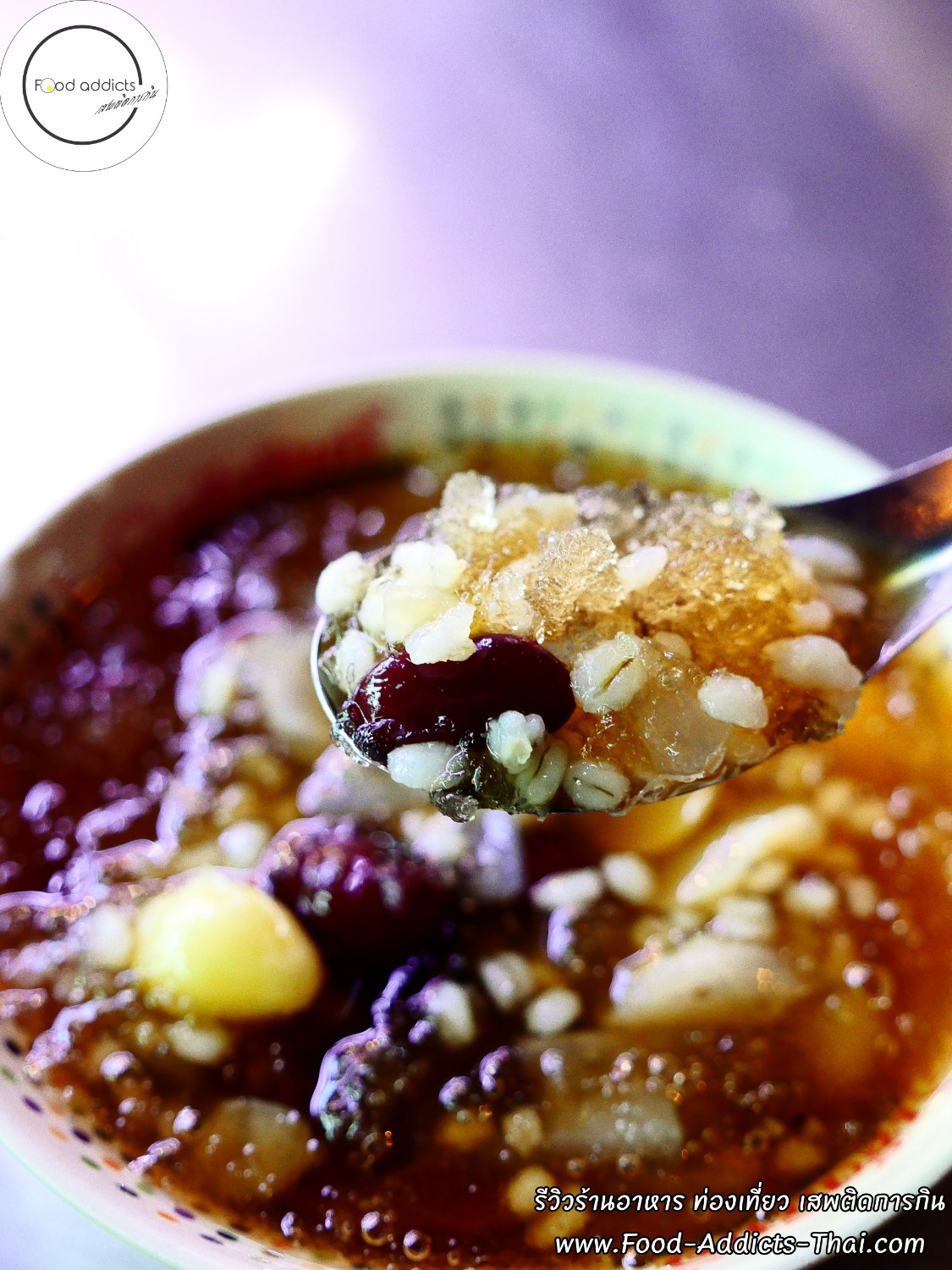เท่าที่ดูแล้วก็ดูเครื่องแล้วก็เหมือนร้านขนมหวานข้างทางทั่วไป แต่จะมีเครื่องพิเศษบางอย่างที่อยู่ในถาดเหล็กที่ไม่เคยเห็นในขนมหวานแบบจีนมาก่อนเช่นเห็ดหูหนู ถั่วปากอ้า เก๋ากี้ และอีก 2 อย่างที่มองไม่ออกว่าเป็นอะไร ยกเว้นรากบัวกับแปะก๊วย ที่ดูแล้วร้านอื่นไม่น่าจะมีขาย ที่สำคัญไม่เห็นมีแมลงวัน ผึ้ง มาตอมอาหารพวกนี้เลย น่าจะเป็นเพราะสีไฟร้านที่ใช้ในร้านด้วยแหละมั้ง สั่งเสร็จแล้วก็เลือกนั่งเลยครับว่าจะนั่งริมถนนหรือในร้านตามสะดวก