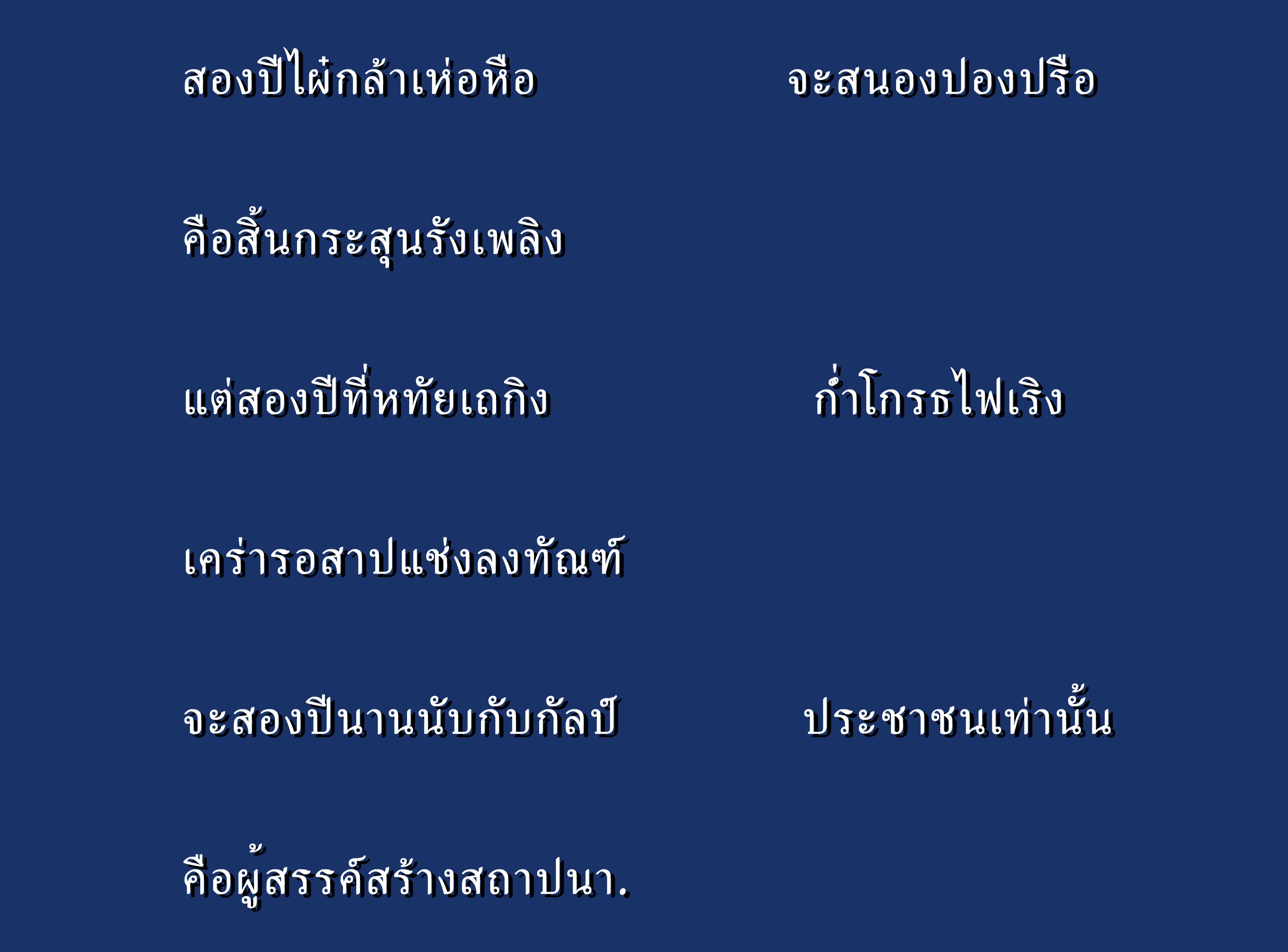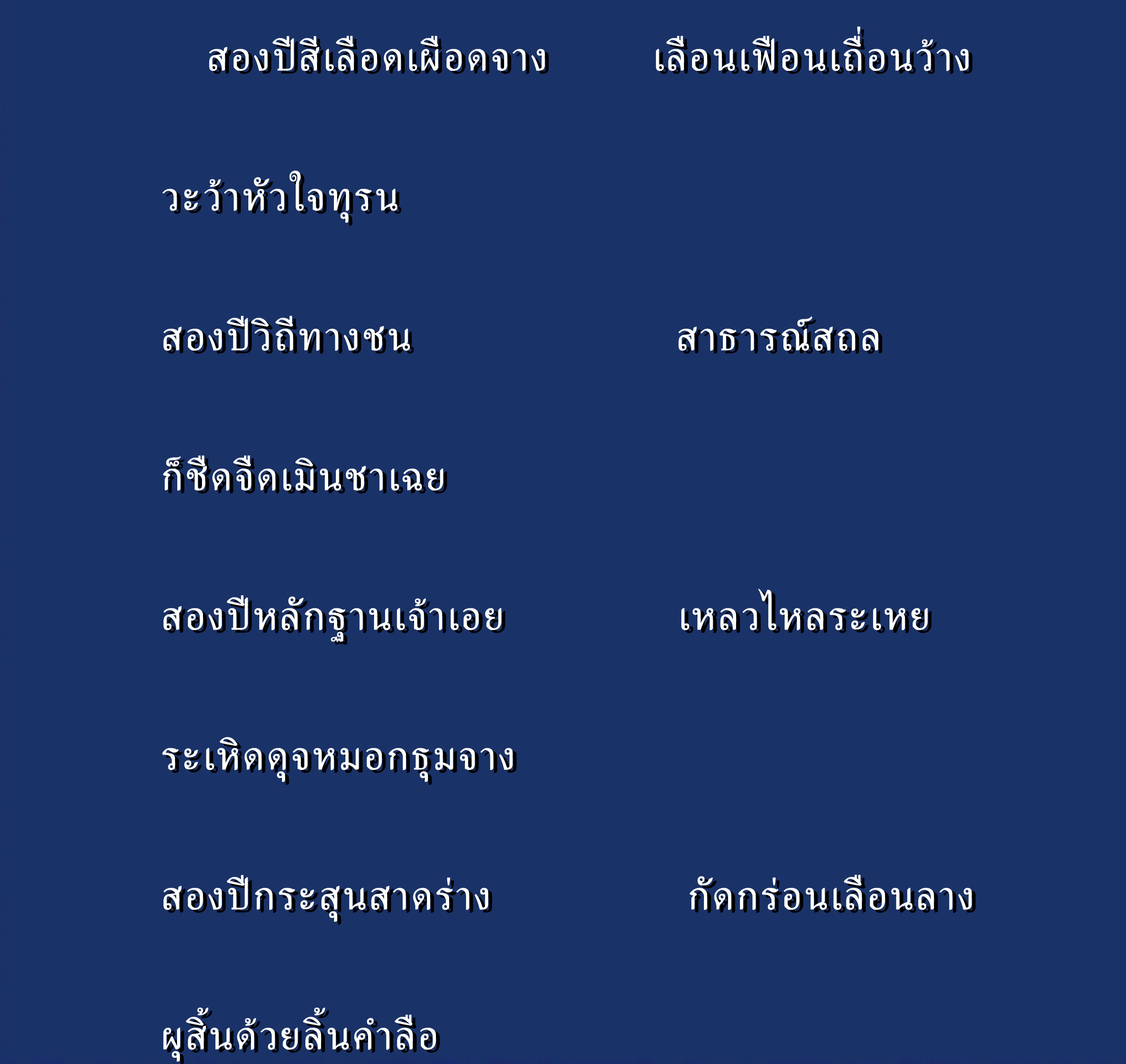 ทิวาทมิฬ นิลกาลก่อจากหรดี อีกาขานจรัสดำ แสงต่ำนานมวลมารแหวก แมกเมฆกรายดิน มืดทั่วทุกทิศ มัวทุกทางเลือนรางสลัว กลัวกรายกินเสียงสนั่น หวั่นหวาดยินไฟรินพื้น แดงเป็นทางเพลิง สว่างจากล่าง ดำจากบนดาวล่องหน