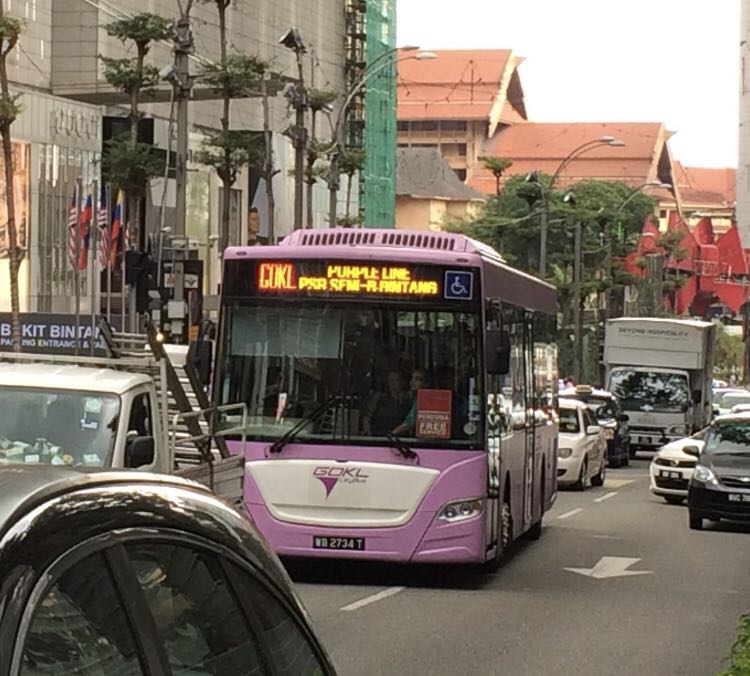 โดยรถทุกสายของ GoKL จะมีสีรถบัสเหมือนกันแบบนี้ แต่จะมีวิ่งหลายเส้นทาง ให้สังเกตที่อักษรบรรทัดแรกหน้ารถให้ดีว่าคันนี้เป็นคันที่วิ่งของสายสีอะไรนะคะ