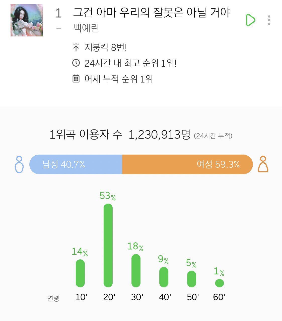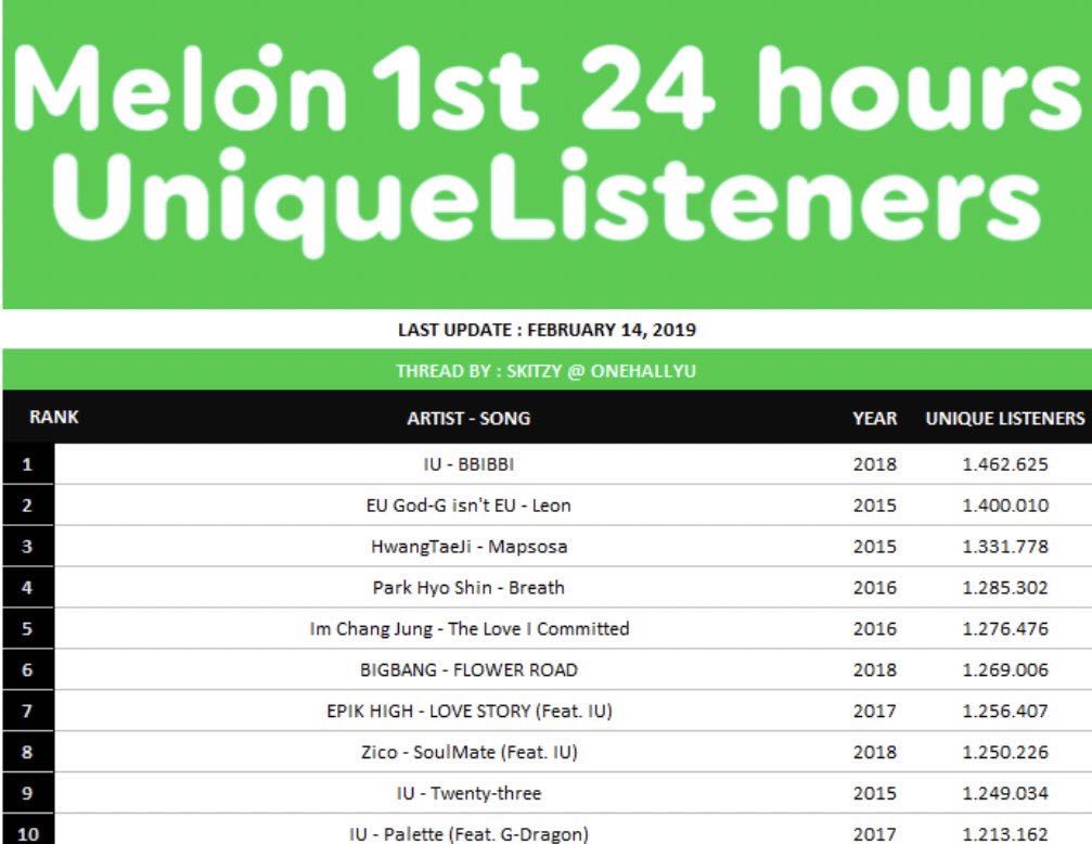 หลังจากปล่อยเพลงลงชาร์ตเมื่อวาน วันนี้ครบ 24 ชม. มียอดผู้ฟังไม่ซำ้ไอดี 1,230,913 คน ซึ่งทำลายสถิติของเพลงที่ปล่อยปี 2019 โดยเจ้าของสถิติเก่าของปีนี้คือ EPIK HIGH ของ MELON Chart