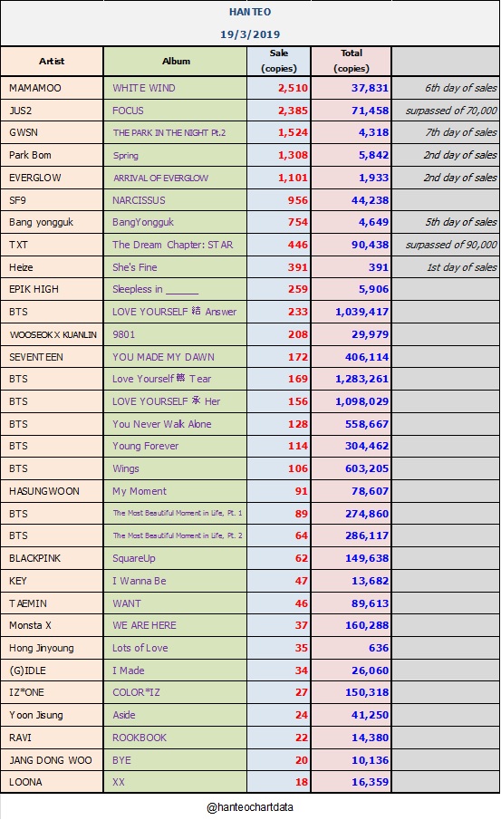 ยอดซื้ออัลบั้มจากชาร์ต HANTEO 19 มีนาคม 2562