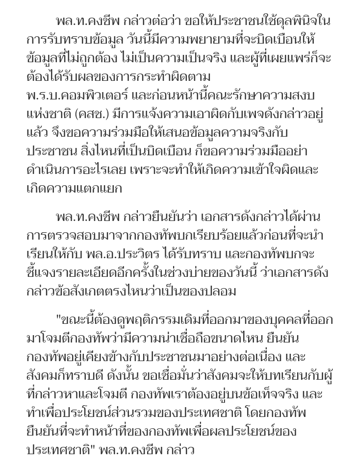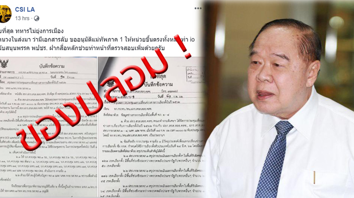 โฆษกกห.เผยกองทัพบกตรวจสอบแล้ว เพจCSI LAปล่อยเอกสารปลอมโจมตีกองทัพ วอนปชช.ใช้ดุลพินิจรับข้อมูล ขณะทบ.เตรียมตั้งโต๊ะแถลงบ่ายนี้ แจงเอกสาร"จุดไหนปลอม"