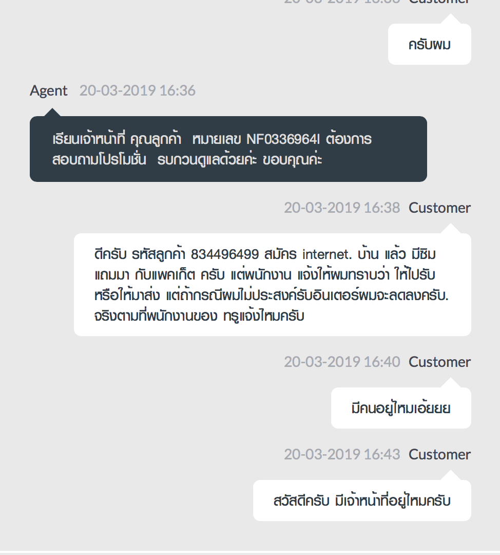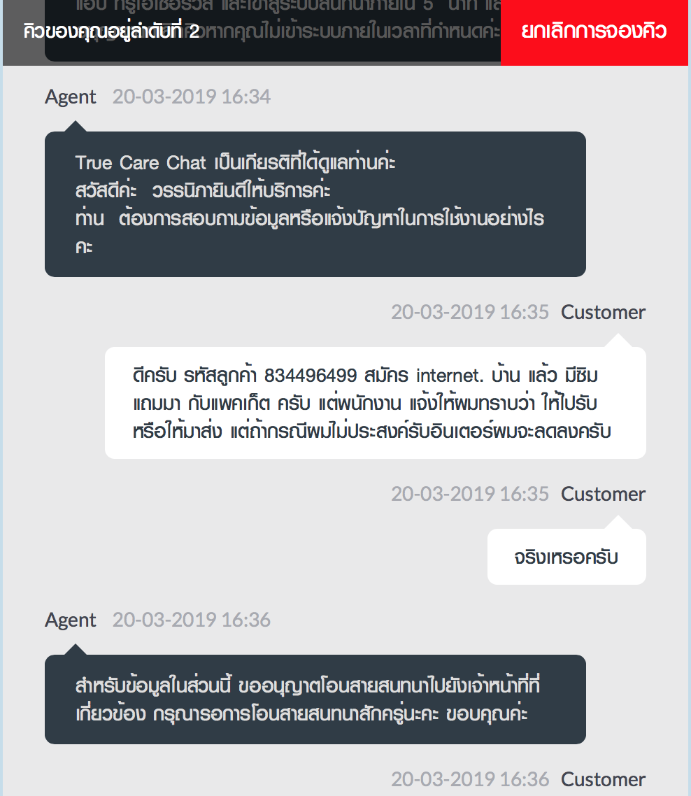 http://trueonline.truecorp.co.th/package แต่ผมประสงค์ไม่รับซิม ทางเจ้าหน้าที่มีการโทรมาแจ้งว่าให้ไปรับซิม หรือ ให้ส่งมา ไม่งั้น โปรอินเตอร์เน็ทบ้านคุณจะไม่ได้ตามโปรโมชั่น เมื่อติดต่อทาง live chat ของทรู ผมได้มีการรอคิว แล้วได้คิว พนักงานได้โอนไปอีกหัวข้อเนื่องจากผมอาจจะเปิดผิดหัวข้อ ผมใช้เวลาในการรอคำตอบจากทรูค่อนข้างนานมาก ไม่เหมือนตอนขออินเตอร์เน็ท เลย