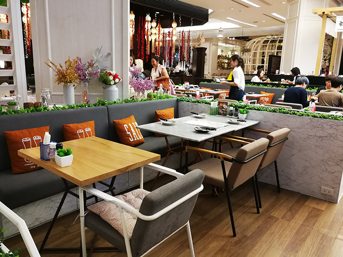 บรรยากาศในร้านก็จะเป็นโต๊ะไม้หรือโต๊ะหิน ค่อนข้าง Modern ครับ บางโต๊ะเป็นโซฟายาวก็จะมีหมอนให้กอดด้วยครับ