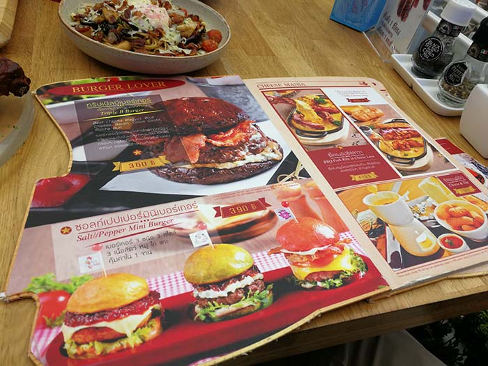 ต่อไปมาชมเมนูอาหารกันบ้างครับ เล่มใหญ่มาก ๆ พยายามถ่ายรูปมาให้เกือบครบทุกหน้าครับ เมนูเด็ดที่ไม่ควรพลาดก็ Salt / Pepper mini Burger ในหน้าแรกเลย เพราะผมกับเพื่อนชอบกินเนื้อคนละอย่าง สั่งมา 3 in 1 แบบนี้ก็ดีครับ ใครชอบชิ้นไหนก็จัดไป