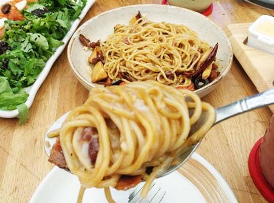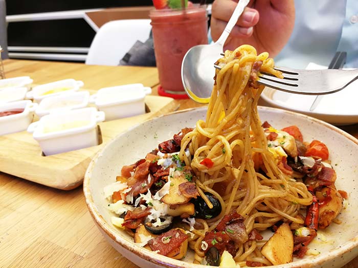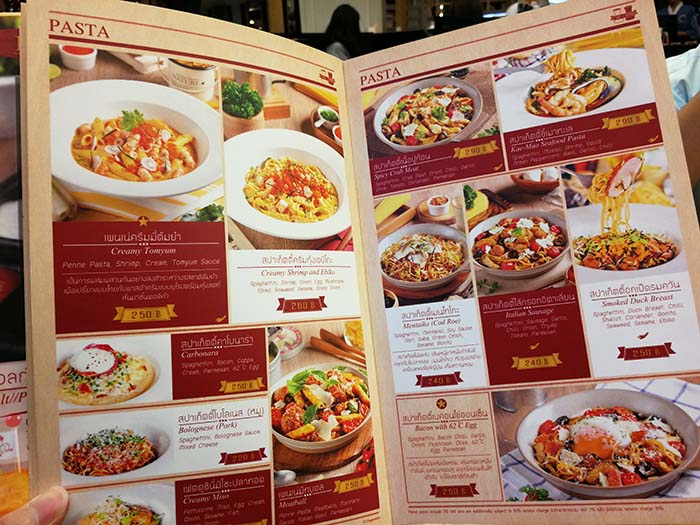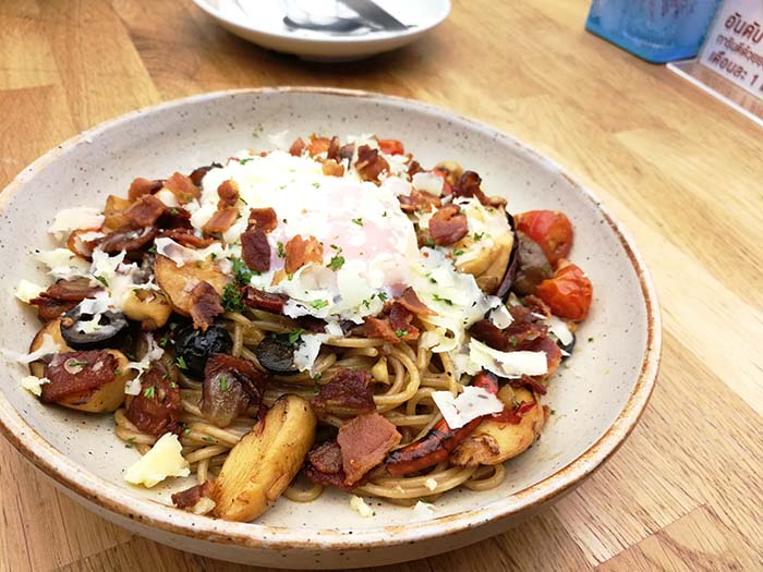 เมนู Pasta มีเยอะมาก และดูน่าทานทั้งนั้น เลยให้น้องพนักงานช่วยแนะนำ เลยได้สปาเก็ตตี้ เบคอน ไข่ออนเซ็น ดูจากรูปก็น่าทานดีครับ จัดไป