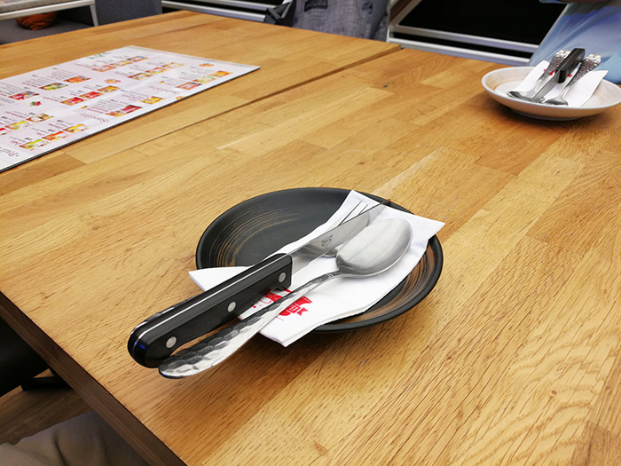 สั่งเสร็จก็สำรวจอาวุธว่าพร้อมหรือยัง แน่นอนที่นี่ต้องมีมีดหั่นสเต็กให้ครับ เพราะสเต็กที่นี่เค้าขึ้นชื่อ หลังจากนั้นนั่งคุยอัพเดทชีวิตกันไปไม่นาน อาหารก็มาครับ
