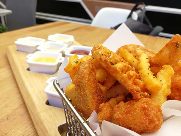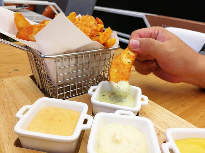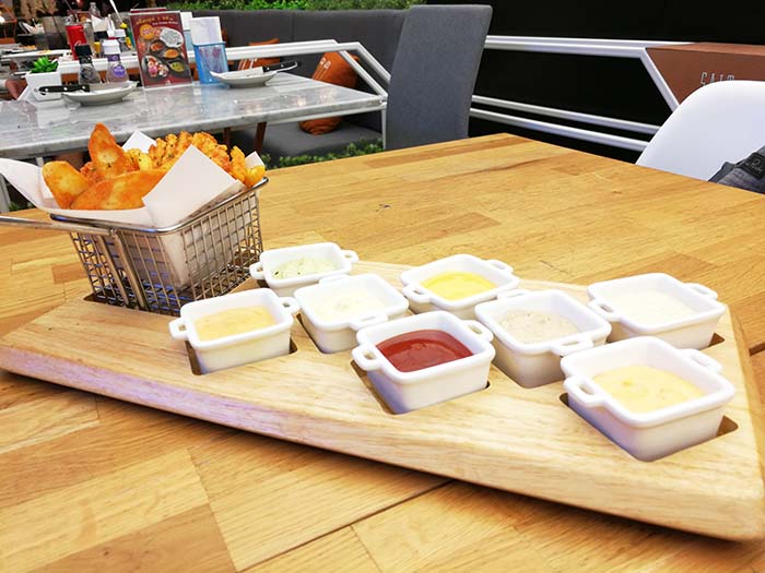 เริ่มด้วย อาหารทานเล่นจานแรก อันนี้เพื่อนผมสั่งครับ มันฝรั่งทอดกับซอส 8 ชนิด จานนี้มันฝรั่งทอดมากรอบดีครับ มีผงปรุงรสโรยมาให้ด้วย และมีการหั่นมาในรูปร่างที่แตกต่างกัน ทำให้เราได้ฟินกับ Texture ที่หลากหลายของความกรอบครับ ซอสในแต่ละถ้วยถือว่าให้มาเยอะ กินมันฝรั่งจนหมดแล้วซอสยังเหลือเลยครับ ดังนั้นเพียงพอแน่นอน ใครชอบจิ้มซอสเยอะ ๆ จัดไป