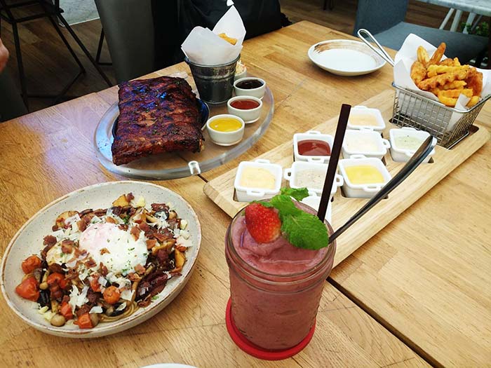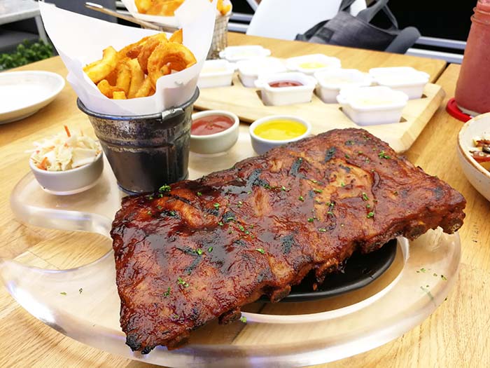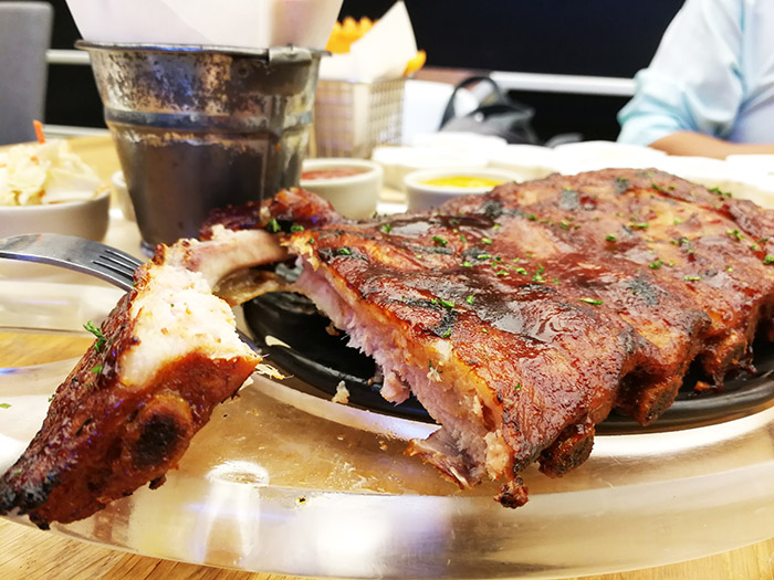 จานที่รอคอยก็มาครับ BBQ spare ribs จานนี้ก็อร่อยครับ กระดูกซี่โครง spare ribs ชิ้นใหญ่ย่างมาหอมดี จานนี้ผมชอบมากๆ มีกลิ่นเครื่องเทศติดจาง ๆ อร่อยใช้ได้ครับ มาพร้อมมันทอดและมีซอสมาให้อีก 3 ชนิด (ข้างหลังมีอีก 8 สรุปวันนี้บนโต๊ะมีแต่ถ้วยซอส 555+)