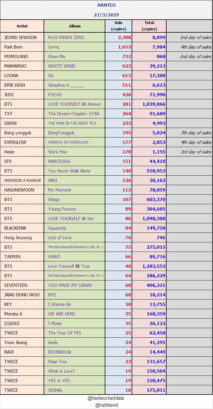 ยอดซื้ออัลบั้มจากชาร์ต HANTEO 30 - 31 มีนาคม 2562 + ยอดขายรวมรายสัปดาห์ + ยอดขายรวมรายเดือน