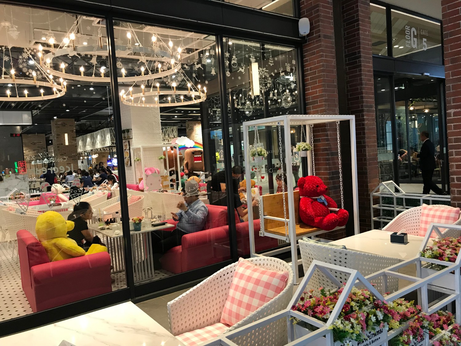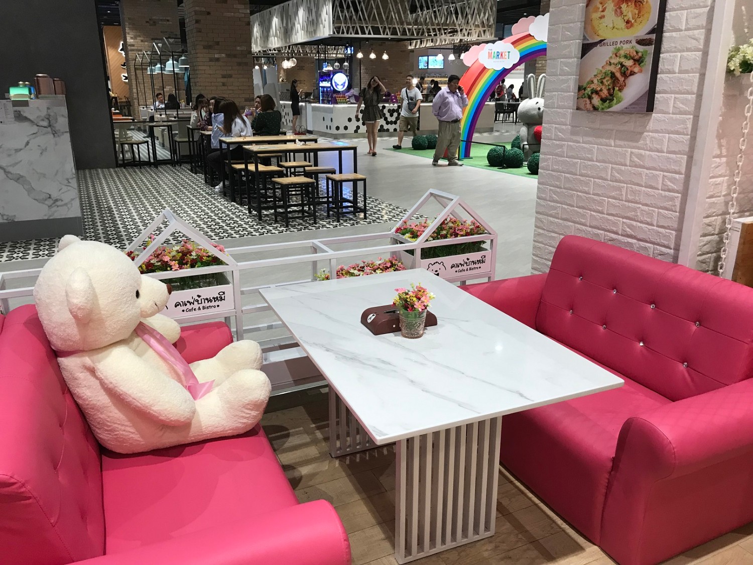 โต๊ะสำหรับนั่งรับประทานในร้าน โซฟาสีชมพูสดใหม่เอี่ยม (เข้าใจว่าร้านเพิ่งเปิดสาขาที่นี่ได้ไม่นาน) มีตุ๊กตาหมีนั่งเป็นเพื่อนด้วยทุกโต๊ะเลย