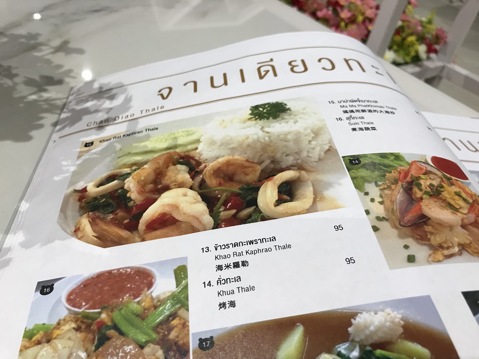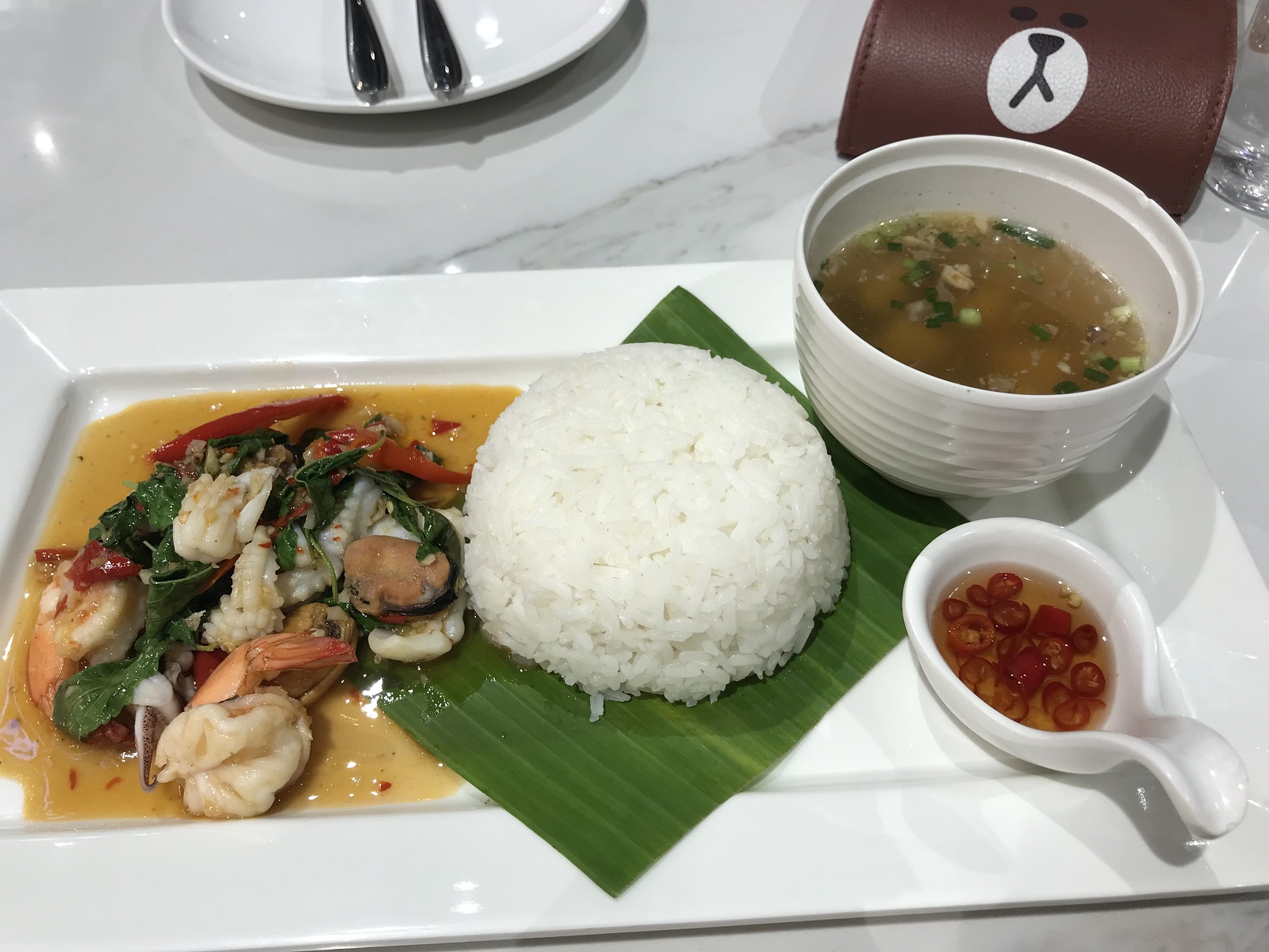 เมนูหลากหลาย จริงๆ มีขนม ของกินเล่น หน้าตาน่ารักเยอะเลย แต่ด้วยความหิวมื้อกลางวัน เราก็มุ่งหน้าที่ตรงนี้ค่ะ มาหยุดที่ข้าวราดกะเพราทะเล