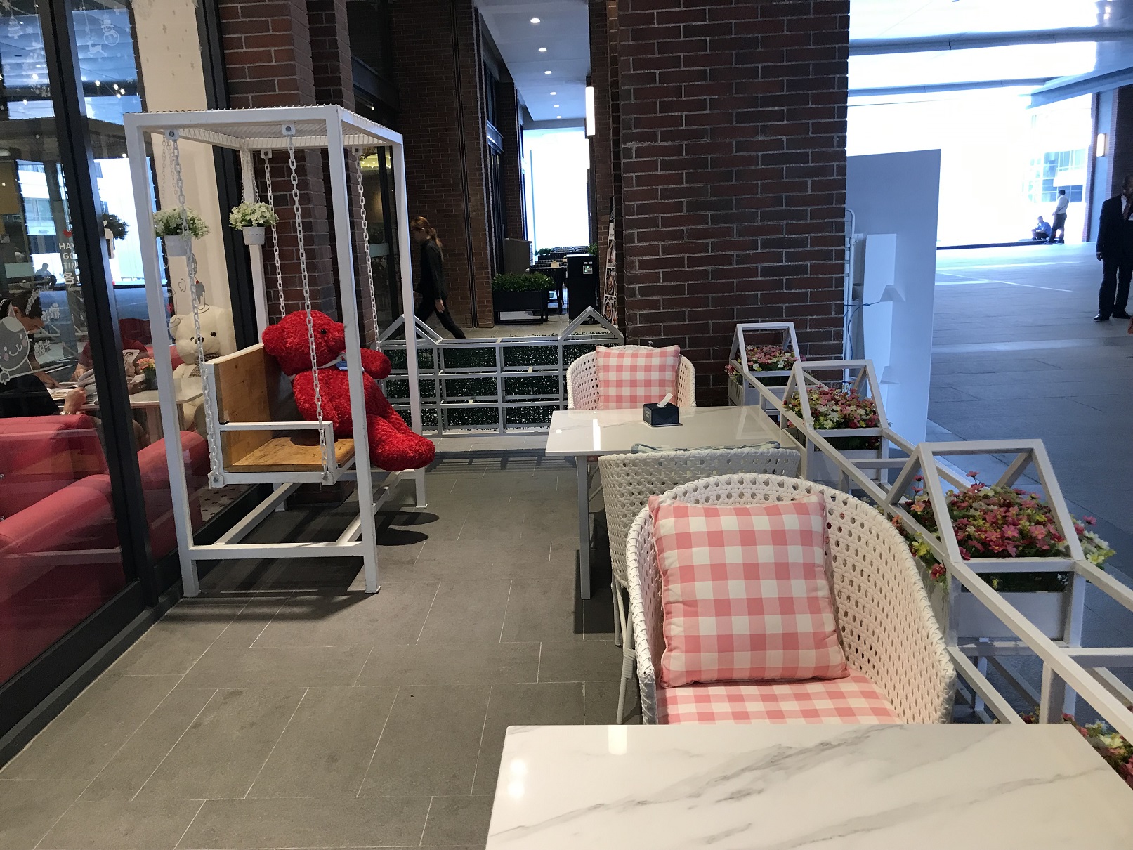 ถ้าไม่ได้นั่งโซฟา ก็จะมีที่นั่งเป็นเก้าอี้หวายสีขาวแบบนี้ค่ะ หมอนและเบาะลายตารางสีชมพู หวานแหววได้อีก ชิงช้าที่น้องหมีสีแดงตัวโตนั่งอยู่ สามารถถ่ายรูปได้ค่ะ เมื่อวานพนักงานก็ช่วยถ่ายให้