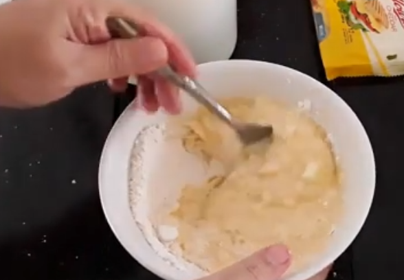 1.ผสมแป้ง,ไข่,ผงฟู,ผงปรุงรส เข้ากับน้ำคนให้แป้งละลายดี ไม่ข้นหรือเหลวจนเกินไป