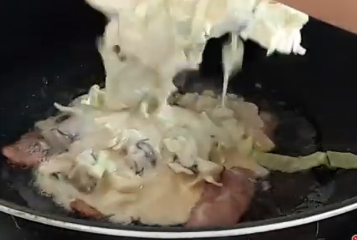 3.ตั้งกระทะใส่น้ำมัน นำเบค่อนลงไปเจียวให้หอมสักครู่ แล้วใส่แป้งที่ผสมแล้วลงไป แผ่ให้ทั่วกระทะหรี่ไฟอ่อน รอจนกว่าแป้งจะสุก