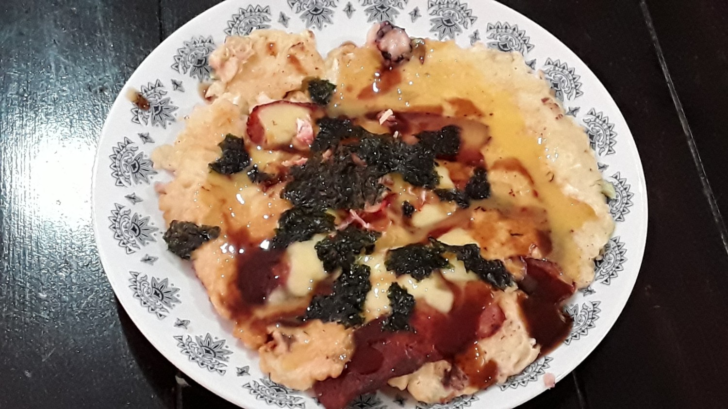 6.ราดหน้าด่วย เมโยฯและซอนโอโคโนมิยากิ วางปลาหมึกแห้งและสาหร่าย