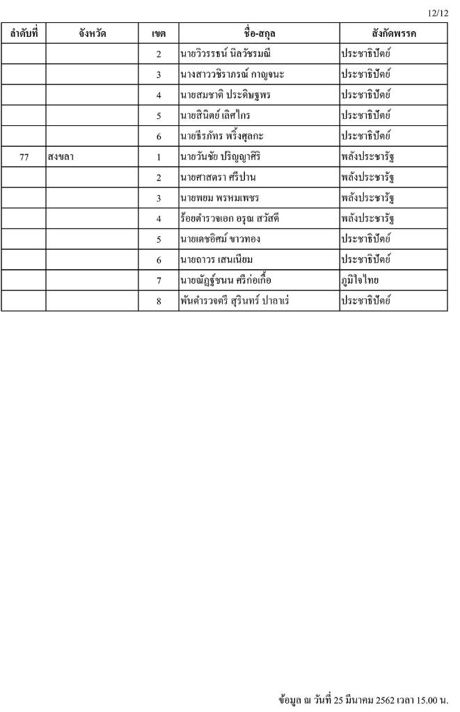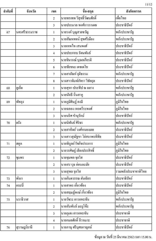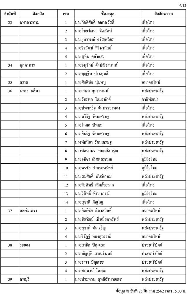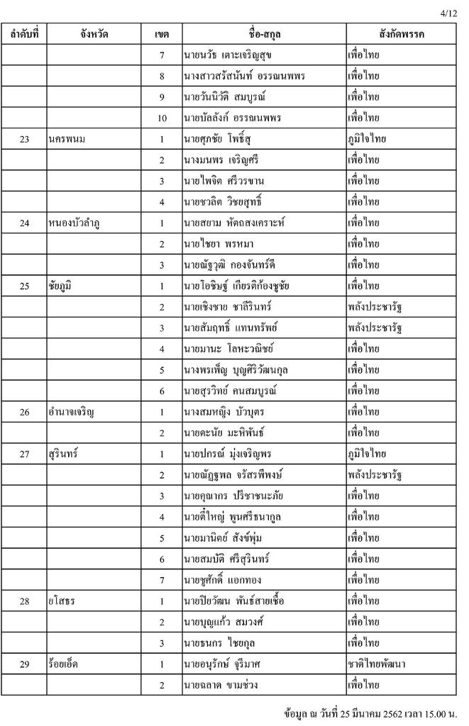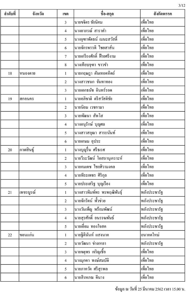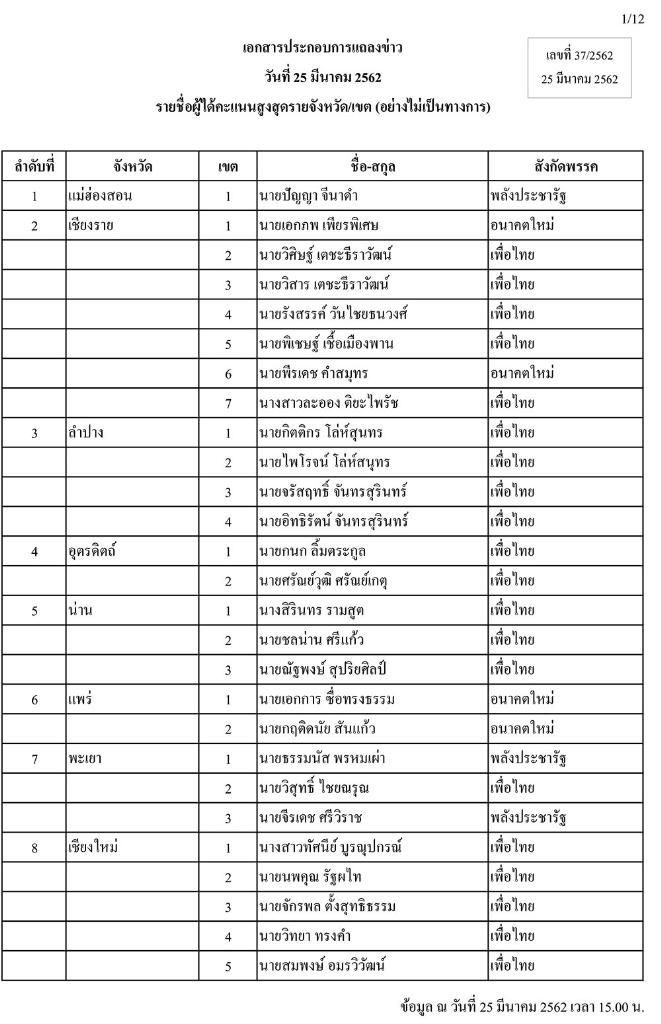 วันนี้ (25 มี.ค.) เมื่อเวลา 16.00 น. สำนักงานคณะกรรมการการเลือกตั้ง (กกต.) ได้แจกจ่ายเอกสารประกอบการแถลงข่าว รายชื่อผู้ได้คะแนนเลือกตั้งสมาชิกสภาผู้แทนราษฎร (ส.ส.) เมื่อวันที่ 24 มี.ค. 2562 สูงสุดรายจังหวัด/เขต (อย่างไม่เป็นทางการ) แก่สื่อมวลชนประจำ กกต. โดยพบว่าข้อมูลแบ่งเป็นลำดับที่ เขต ชื่อ-นามสกุล และสังกัดพรรค ที่ได้รับคะแนนสูงสุดเพียงอย่างเดียว โดยไม่มีตัวเลขคะแนนที่ได้รับแต่อย่างใด