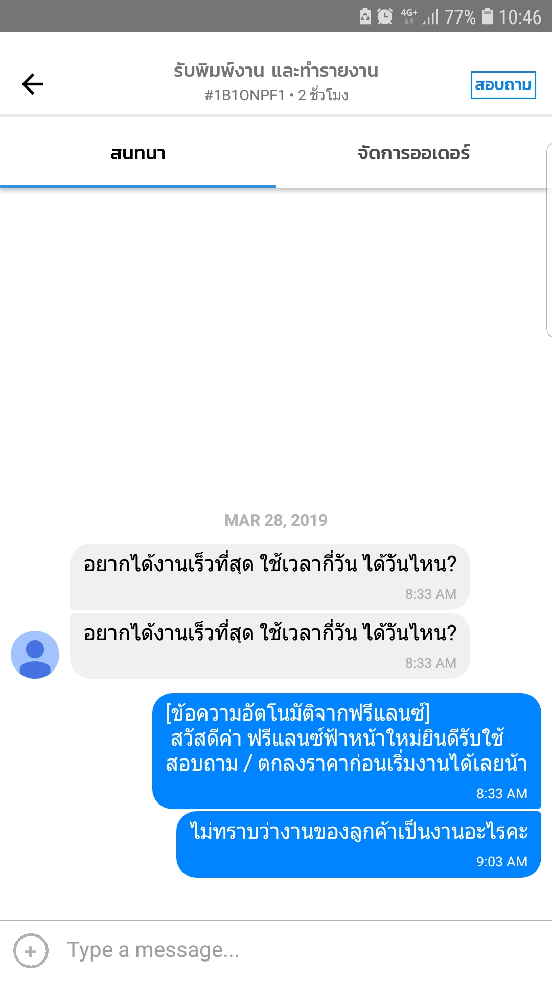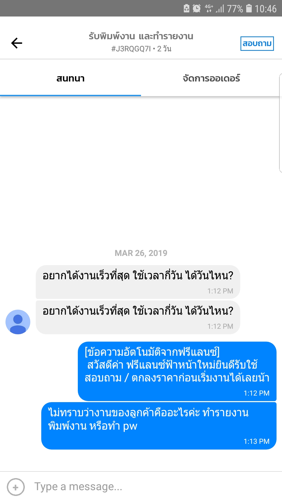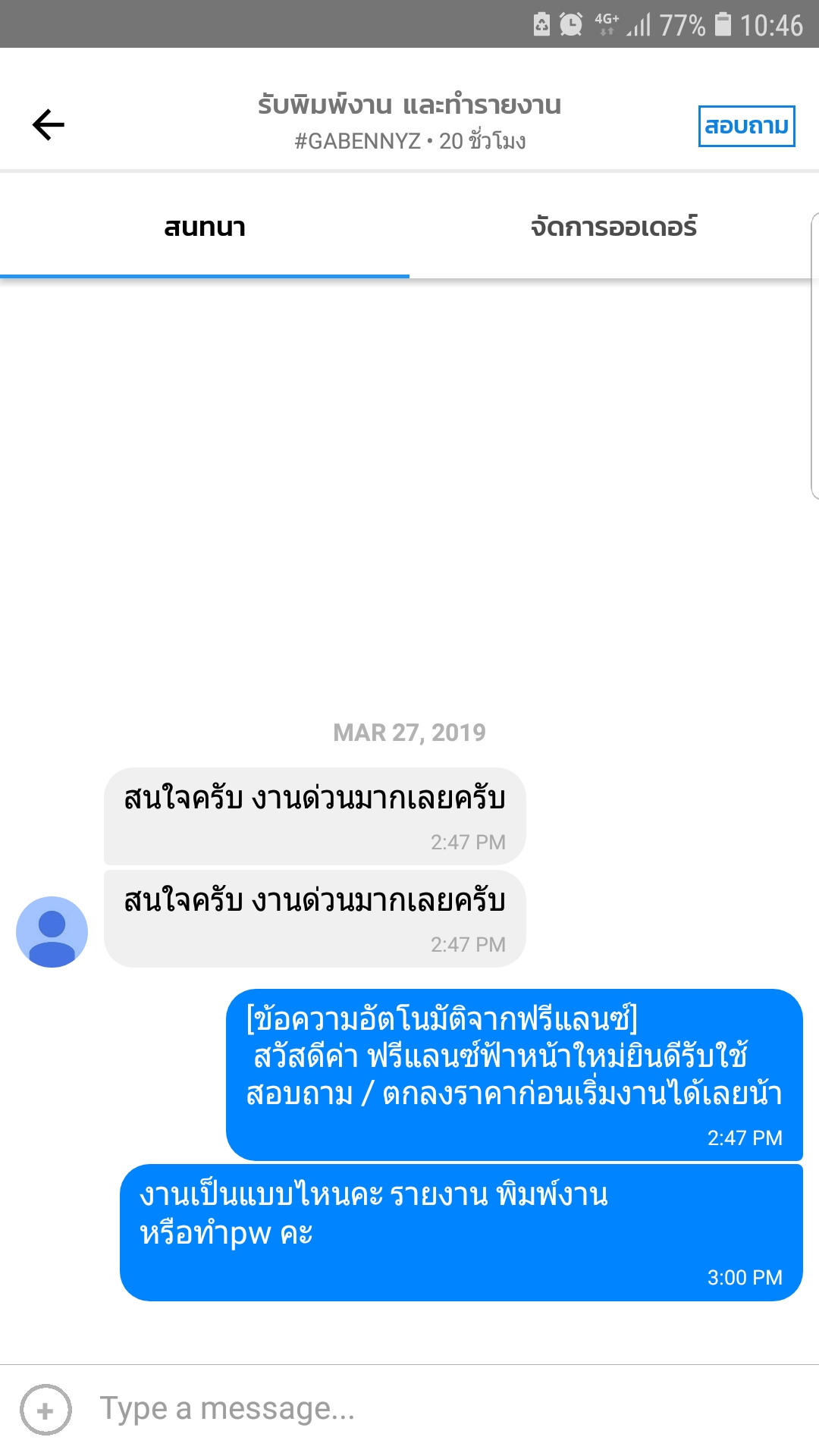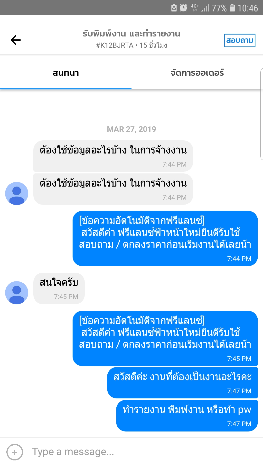 สวัสดีค่ะ คือเรามีข้อสงสัยเกี่ยวกับการรับงานในเว็บ fastwork คือเราก็รับงานปกติ แรกๆก็โอเคคือลูกค้าที่ทักมาคุยรู้เรื่อง แต่พอพักหลังจะมีข้อความจากว่าที่ลูกค้า ซึ่งคาดว่าคนละคนเพราะเลขออเดอร์ต่างกันและข้อความเด้งมาคนละแชท แต่ข้อความที่ว่ามันแปลกๆ ตามรูป