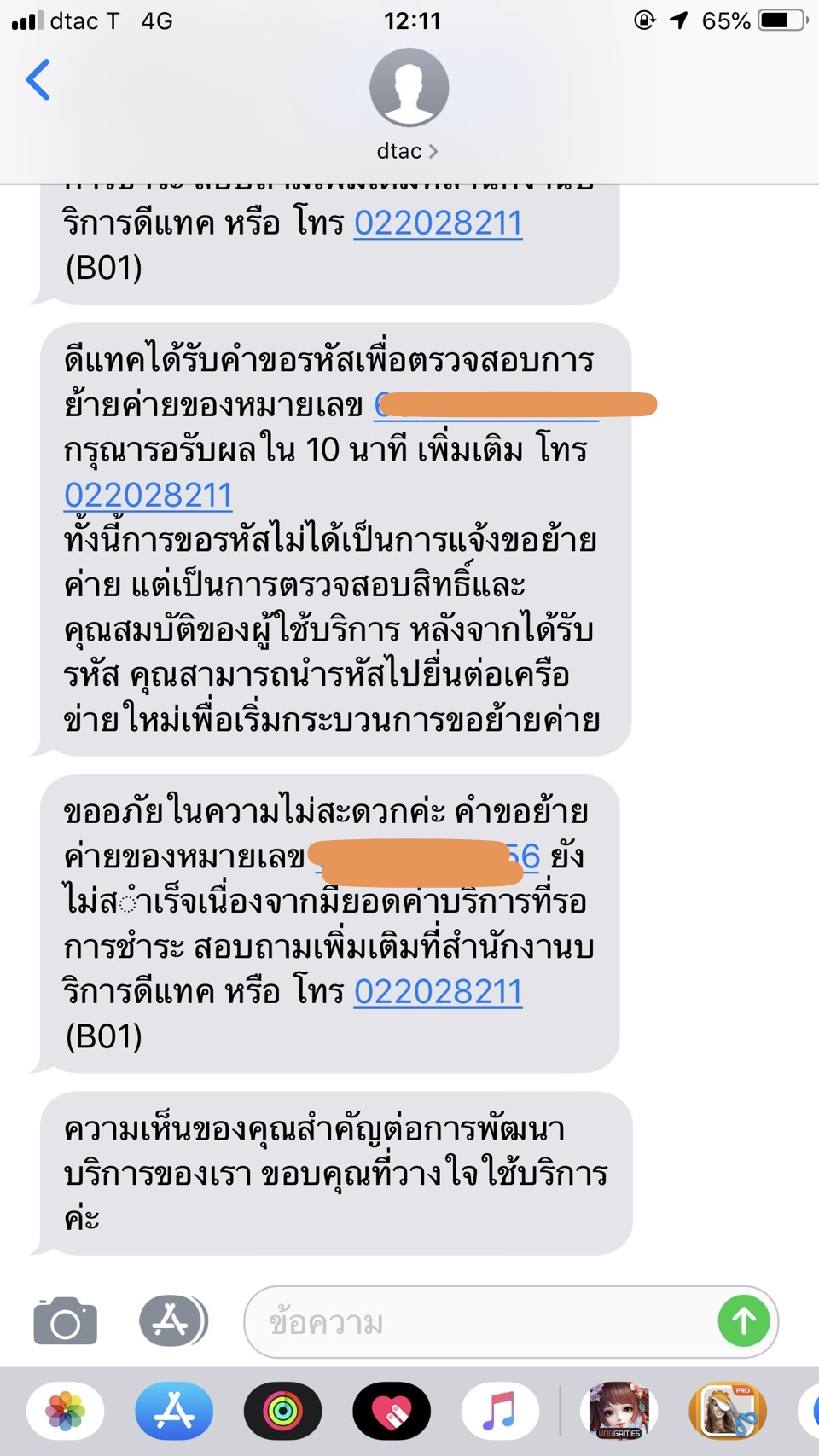 ต้องการทราบชื่อ หมายเลขบัตรประชาชน เบอร์ แจ้งนะครับ เข้าใจว่าหน้าที่ยื้อคือหน้าที่คุณ แต่แค่ครั้งเดียวพอครับ อย่ายื้อจนน่ารำคาญ สมคำร่ำลือจริงๆเรื่องย้ายค่ายDtacเนี่ย ใช้เงินจ่ายครับ ไม่ได้ใช้ใบตองจ่าย จะได้เวลาย้ายค่าย จะได้เรื่องมาก