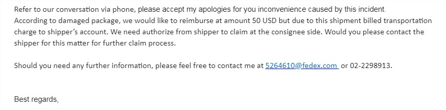พัสดุที่ได้รับเสียหายชำรุด จากบริการขนส่งFedEx จะต้องชดใช้เรากี่บาทคะ