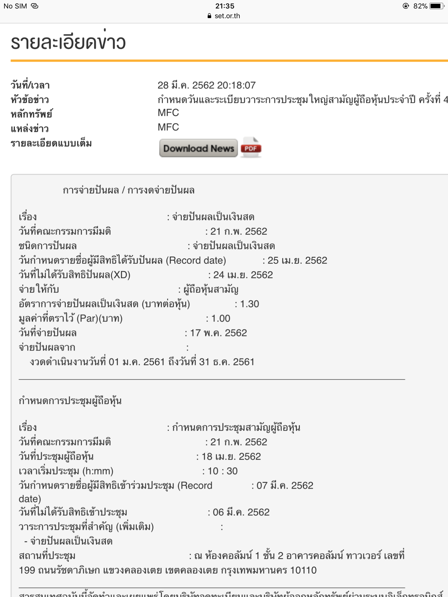 MFC ประกาศจำนวนจ่ายปันผล 1.30