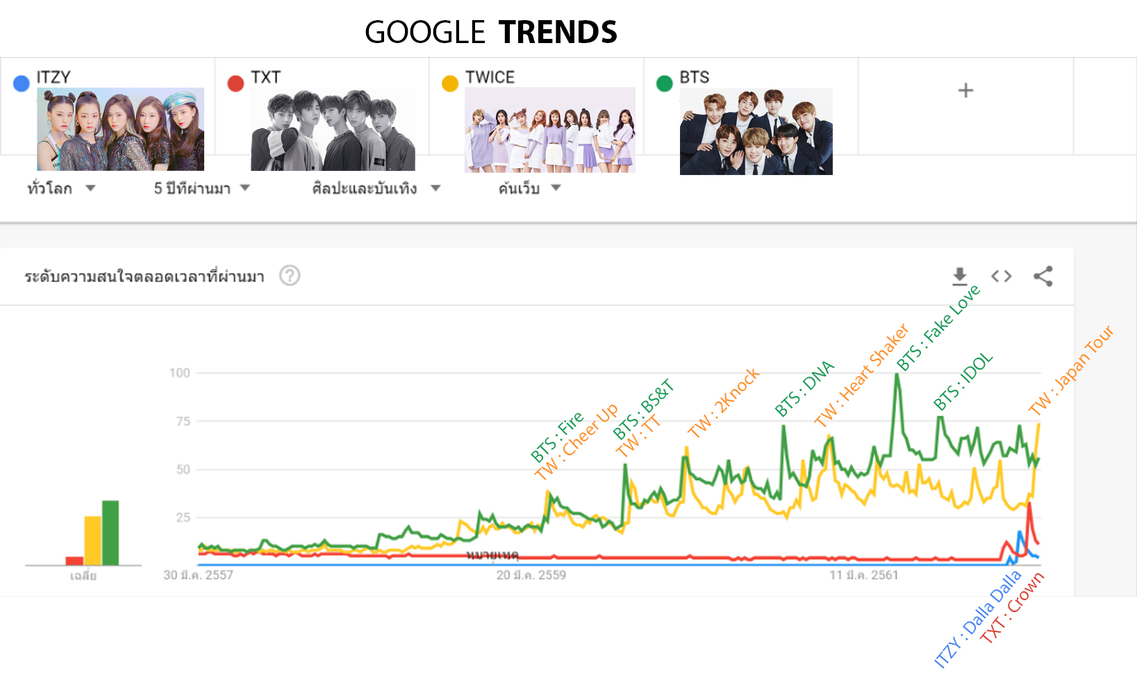 และในชาร์ต Google Trend นี้ ผู้เขียนจะขออนุญาตนำข้อมูลของวง Twice และ BTS มาใช้เป็น Reference ด้วย เนื่องจากจำเป็นต้องใช้ข้อมูลในอดีตมาเป็นฐานในการวิเคราะห์