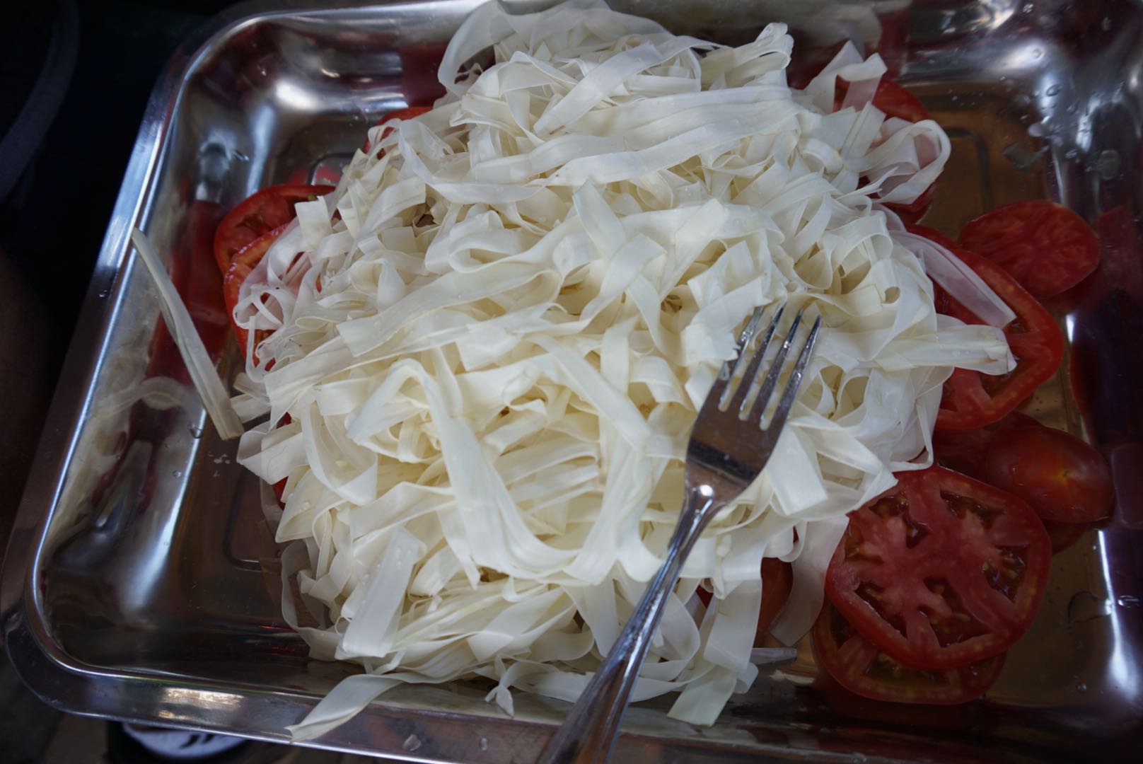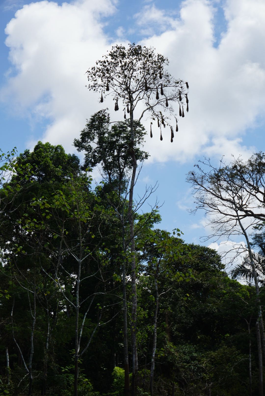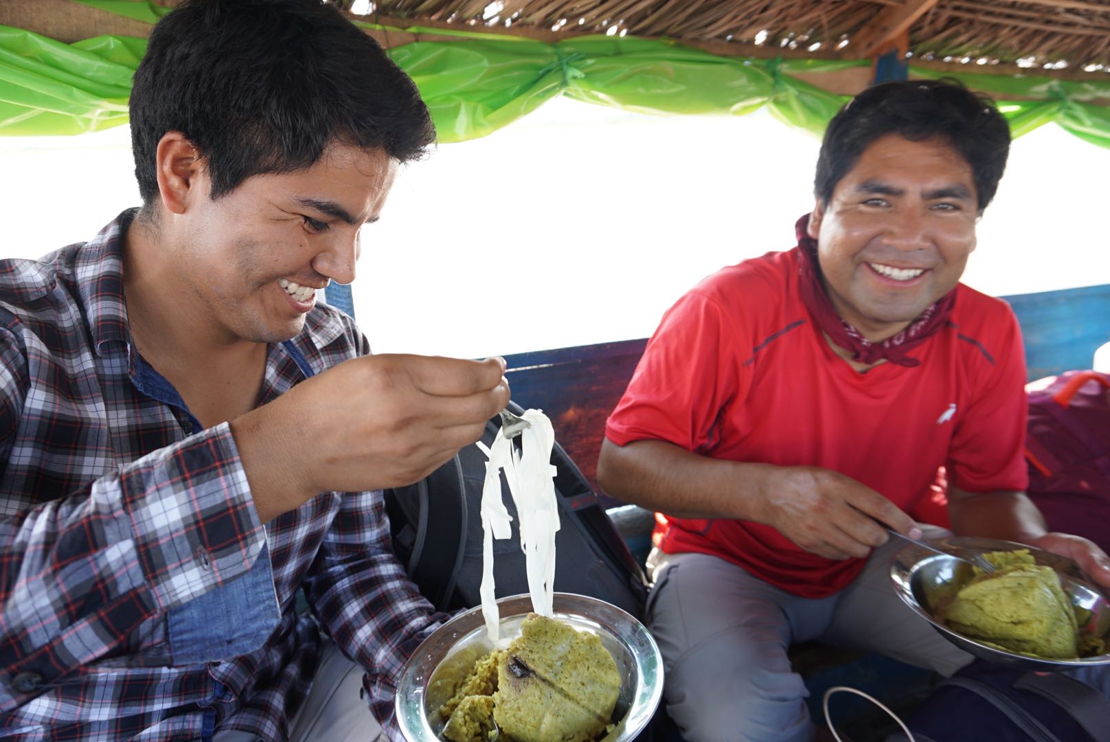 ลงเรือหางยาวนั่งมา3 ชม ระหว่างนั่งเรือเราก็มีอาหารเที่ยงเป็นข้าวห่อใบไม้ (ห่อมาเหมือนบะจ่าง) ข้างในเป็นเหมือนข้าวหมกไก่ ข้าวห่อใบไม้นี้เป็นอาหารที่กินในช่วงเทศกาลที่คนจะทำไว้เยอะๆ กินแล้วดื่ม เมาแล้วตื่นขึ้นมากินใหม่ กินได้หลายวัน กินกับผักที่มาจากต้นปาล์ม เส้นขาวๆ เค้าบอกว่าเป็น สปาเกตตีของคนป่า อร่อยกรอบๆกรึบๆ
