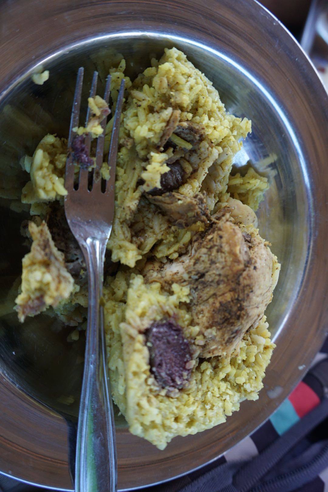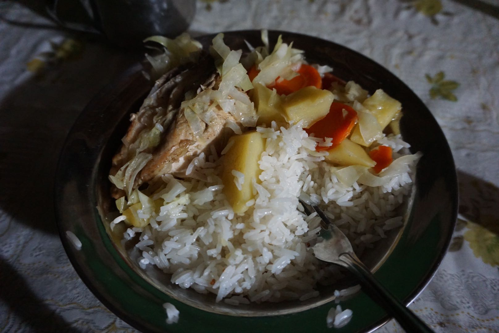 ระหว่างเราอาบน้ำ พรานคาลอสกับคนเรือชื่อเฟอนานโด้ ก็จักแจงทำกับข้าวในเรือ มื้อเย็นนี้เรามี ข้าวกับไก่+ผัก อร่อยมาก ชอบ กินเยอะเลย