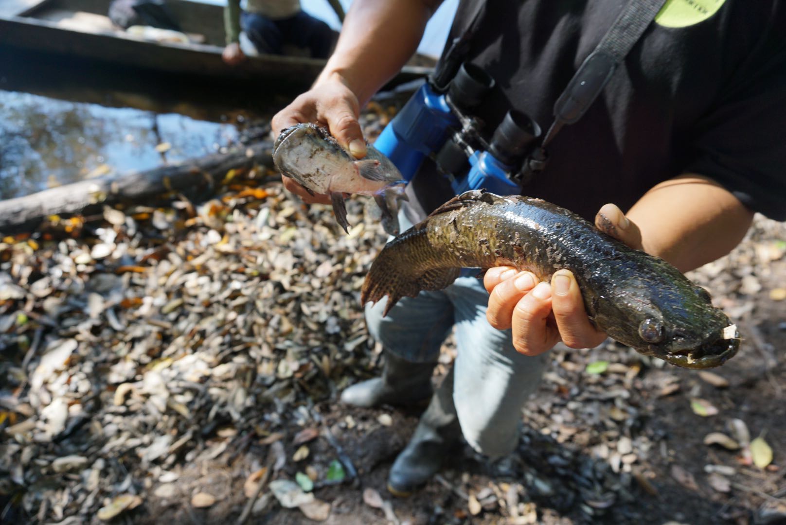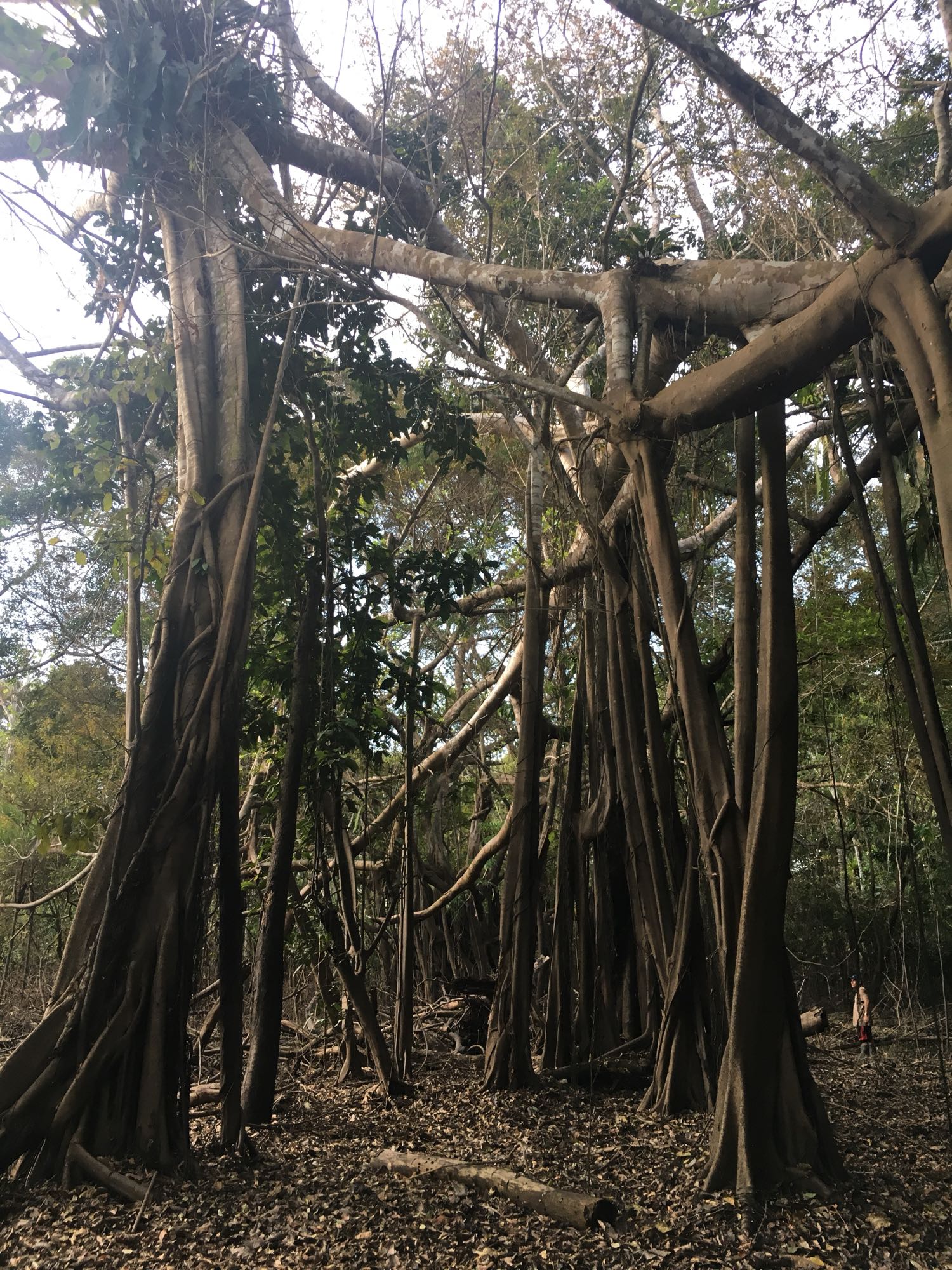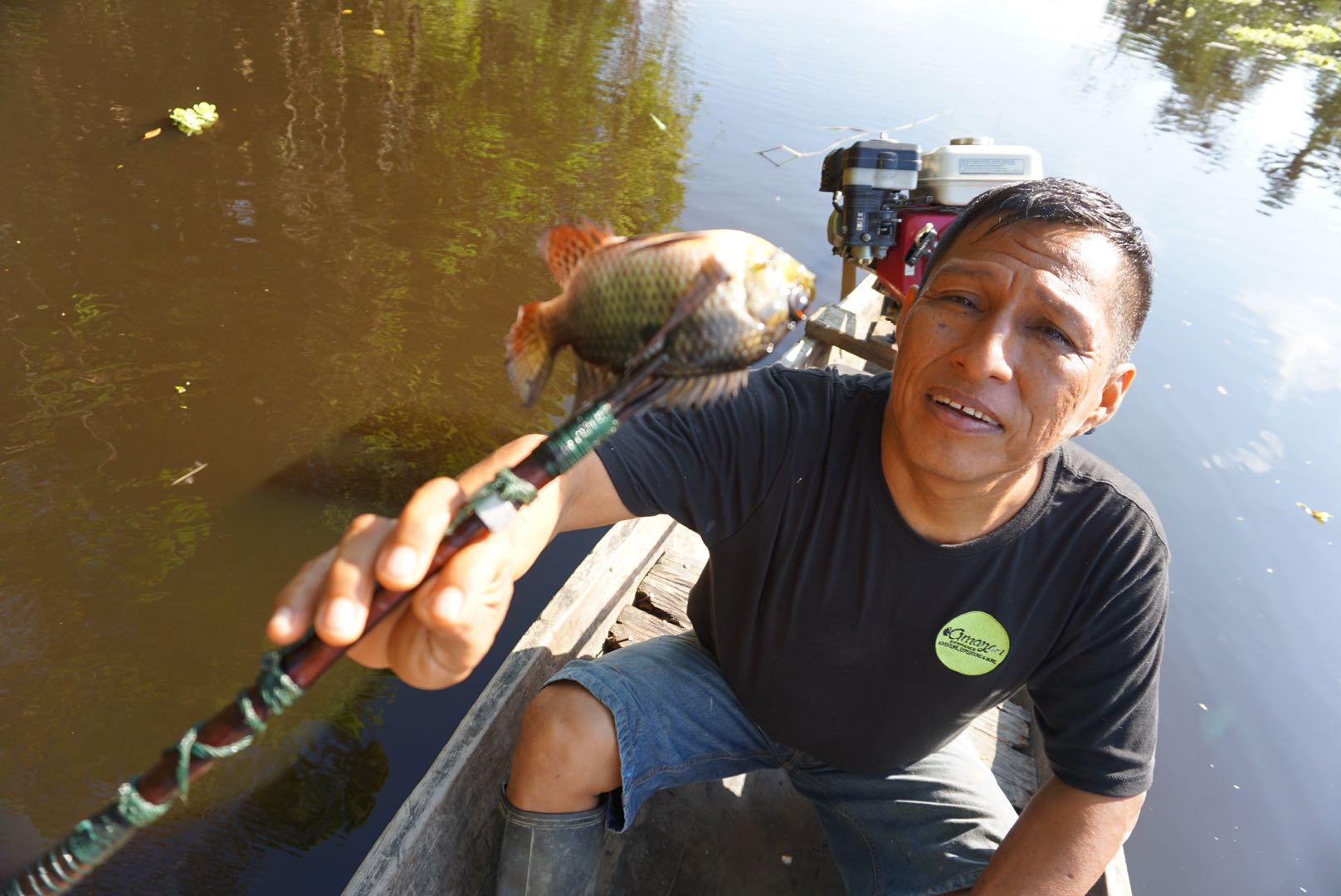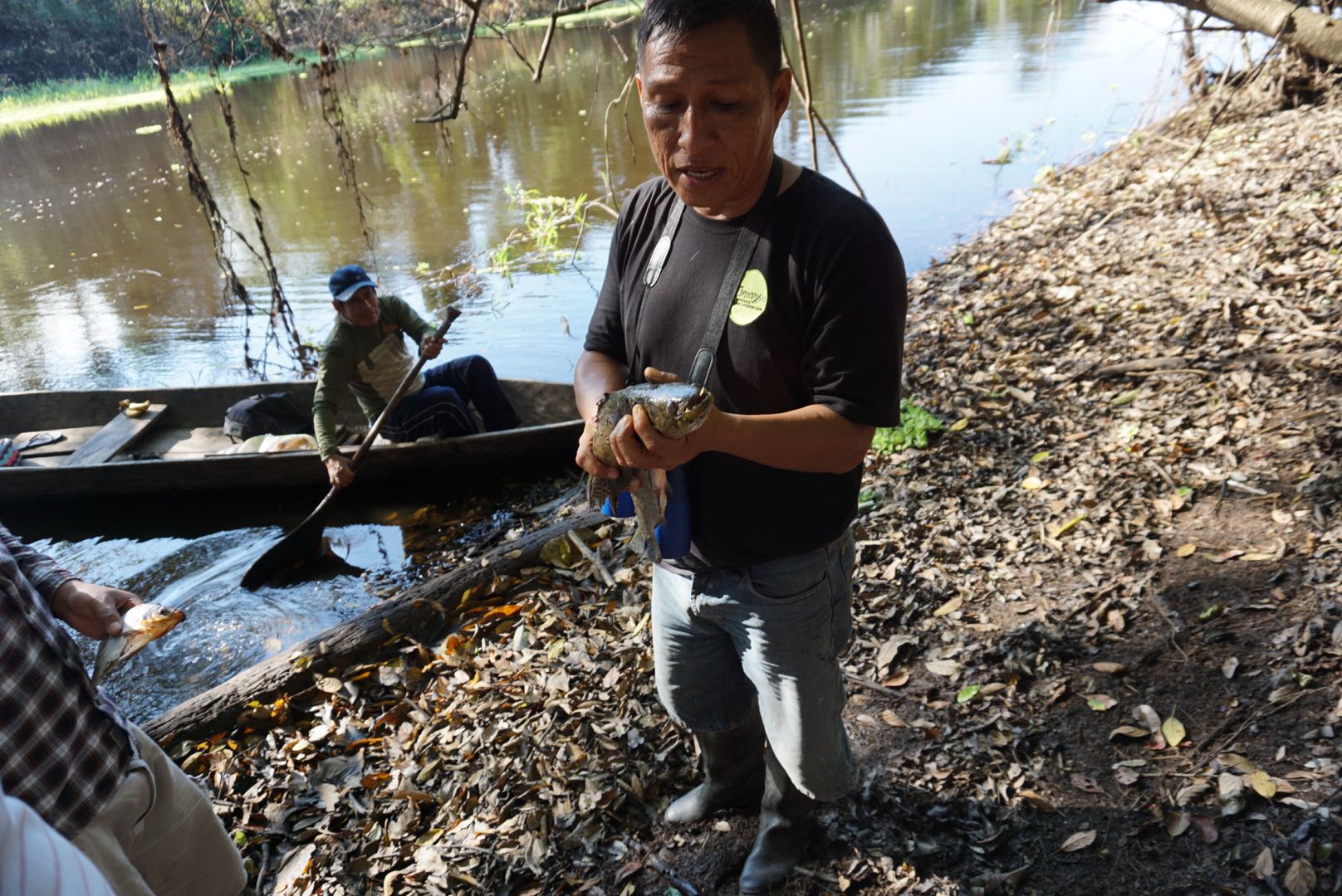 เราก็พายเรือไปส่องสล็อธต่อ เดินเข้าไปในป่ามองหาจนเมื่อยคอก็ไม่เจอสักตัว เดินชมนกชมไม้ ไปเรื่อยๆ ต้นไม้แถวนี้ใหญ่มาก ระหว่างทางก็หวังว่าจะเจออนาคอนด้าสักตัว คาลอสบอกว่ามันยากมากที่จะเจออนาคอนด้า เค้าเดินป่ามาเป็นสิบๆปี เจอแค่ 3-4 หนเอง เราเลยออกมาจะขึ้นเรือ พี่คนขับเรือ เฟอนานโด้ ได้ปลามาเป็นกิโลแล้ว จากการแทงฉมวก เราก็ได้ปลามาเป็นอาหารเช้า