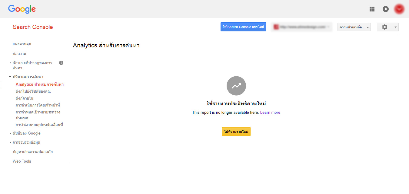โดยล่าสุดก็จะเห็นว่าทุกเมนูนั้นถูกปิดการใช้งานทั้งหมด และมีการแจ้งเตือนเพื่อให้ไปดูใน Search Console เวอร์ชั่นใหม่ที่เข้ามาแทนที่ แต่เพื่อนๆ ก็ไม่ต้องกังวลใจไป เพราะ Google ได้บอกว่าของใหม่มาแทนที่ใน Google Search Console เวอร์ชันเก่านั้นใช้งานได้ดีกว่าเดิม