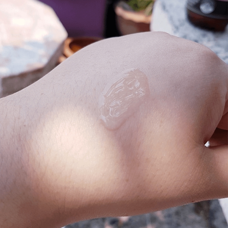 เนื้อสีขาวขุ่นพอทาลงบนผิวแล้วเนื้อชุ่มชื่นกว่าเปปไทด์เยอะเลย คือทาแล้วหน้าแอบมัน
