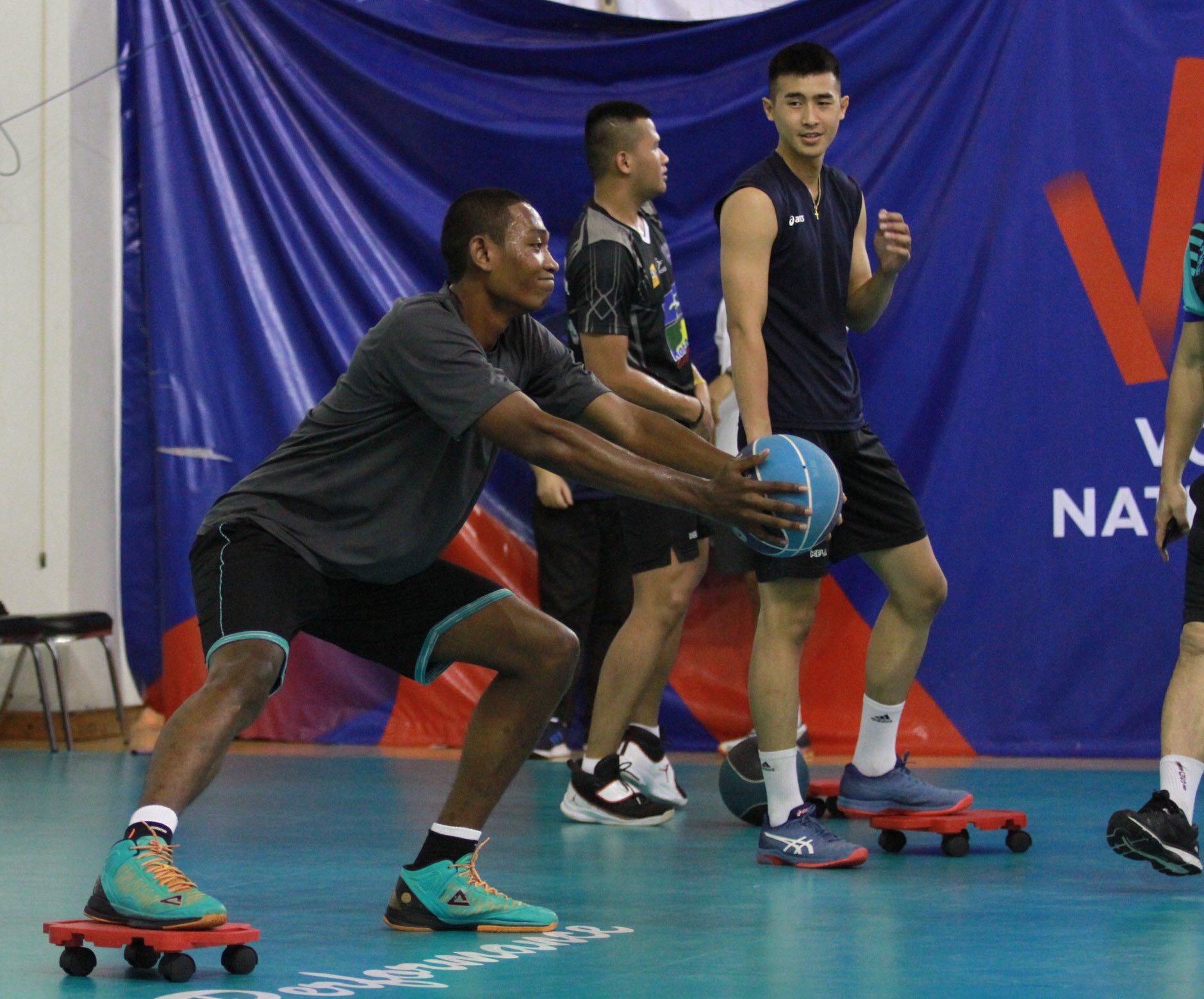 นาวาอากาศโท มนต์ชัย สุภจิรกุล หัวหน้าผู้ฝึกสอนวอลเลย์บอลทีมเอสโคล่า นำลูกทีมลงซ้อมที่สนามเทียนมู ยิมเนซียม กรุงไทเป ไต้หวัน ซึ่งเป็นสังเวียนแข่งขัน SMM วอลเลย์บอลสโมสรชาย ชิงชนะเลิศแห่งเอเชีย 2019 ยืน