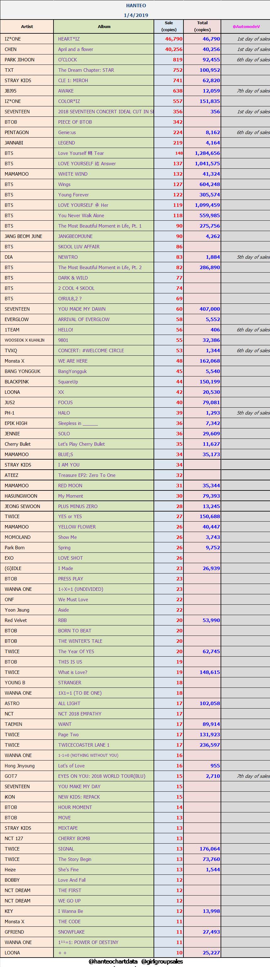 ยอดซื้ออัลบั้มจากชาร์ต HANTEO 1 เมษายน 2562