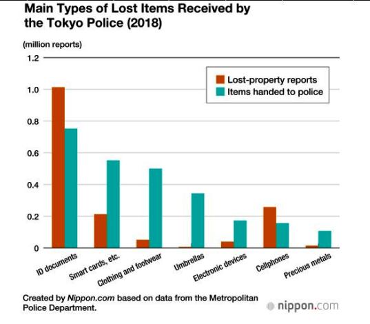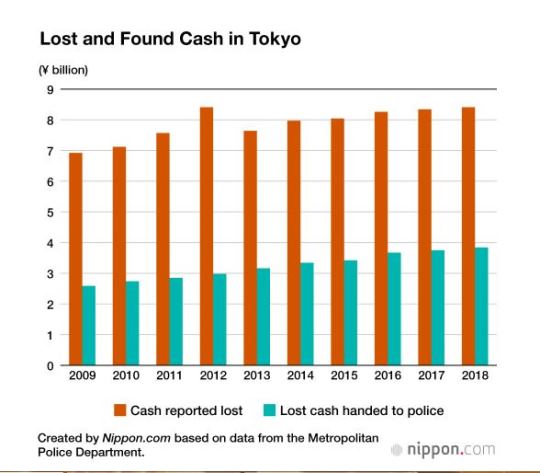 สำนักงานตำรวจกรุงโตเกียวระบุว่า ในปี 2561 มีพลเมืองดีนำเงินสดที่พบว่าตกหล่นในที่ต่างๆ มาให้กับเจ้าหน้าที่เพื่อตามหาเจ้าของรวมมากกว่า 3,800 ล้านเยน โดยเกือบครึ่งหนึ่งเจ้าของได้รับคืนในปีที่แล้ว มีผู้ที่แจ้งกับเจ้าหน้าที่ตำรวจว่าทำเงินสดหล่นหายในกรุงโตเกียวรวมมูลค่าราว 8,400 ล้านเยน เพิ่มขึ้น 2.4% จากปีก่อนหน้า และเพิ่มขึ้นมากที่สุดเป็นประวัติการณ์ 3 ปีต่อเนื่อง