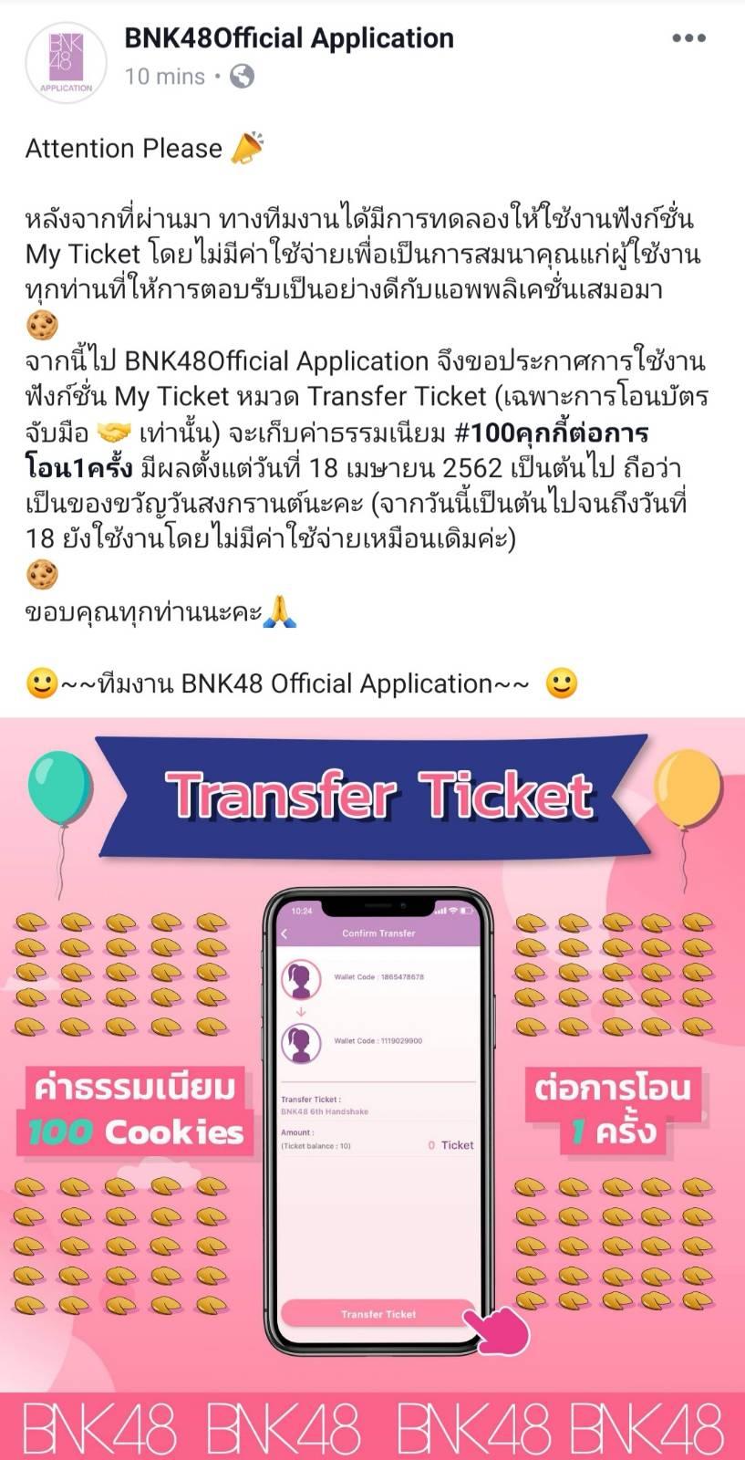 Transfer บัตรจับมือในแอพ BNK48 ครั้งละ 10 บาท