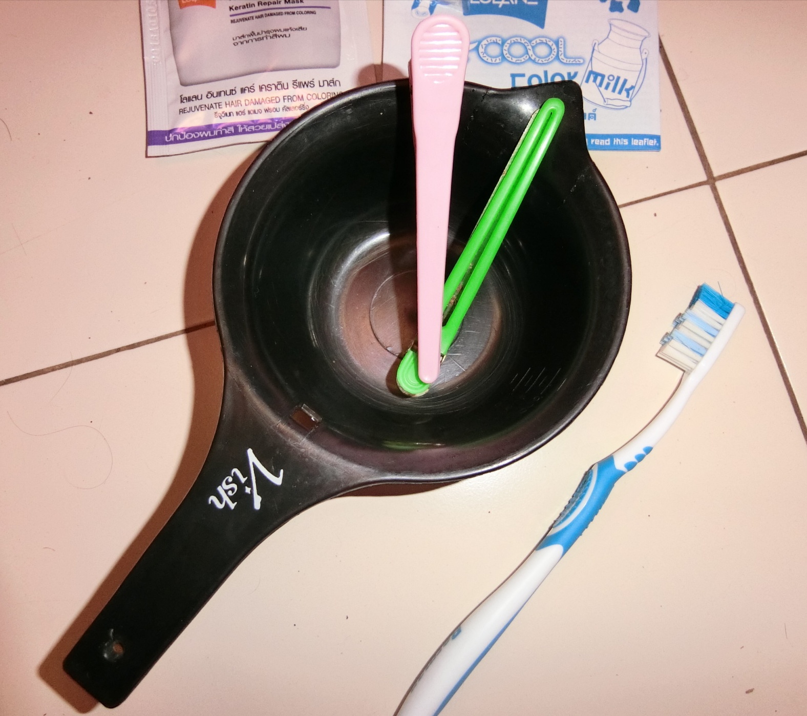 4. ถ้วยผสมสี + แปรง + กิ๊บไว้เเบ่งผม
