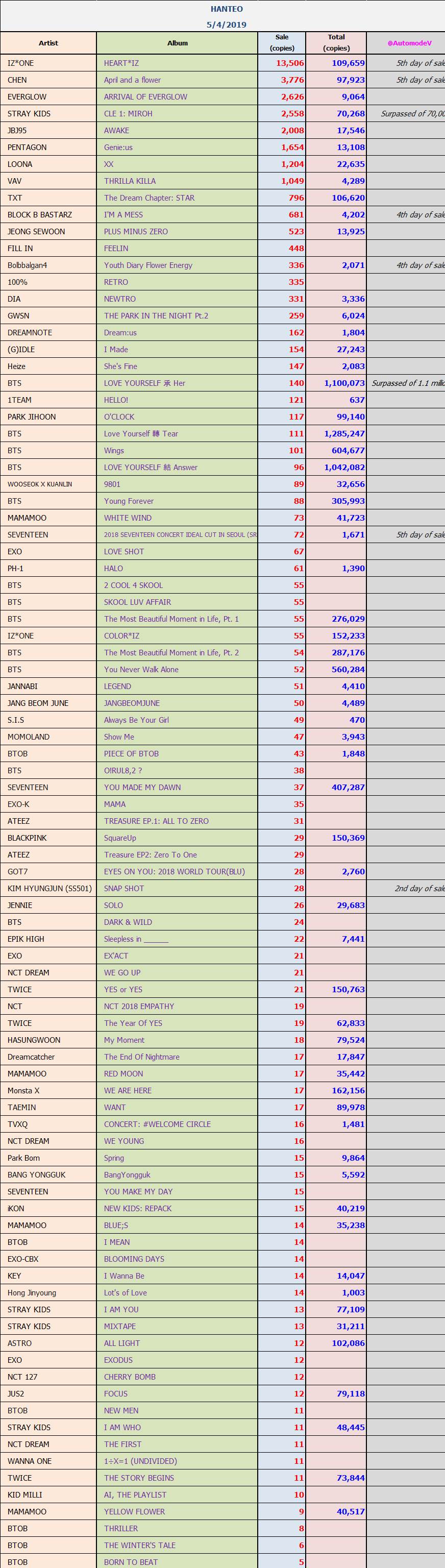 ยอดซื้ออัลบั้มจากชาร์ต HANTEO 4 เมษายน 2562