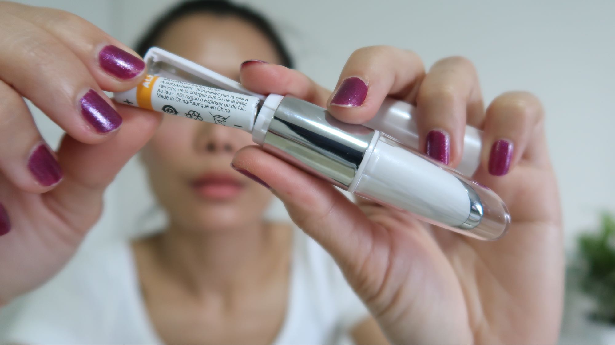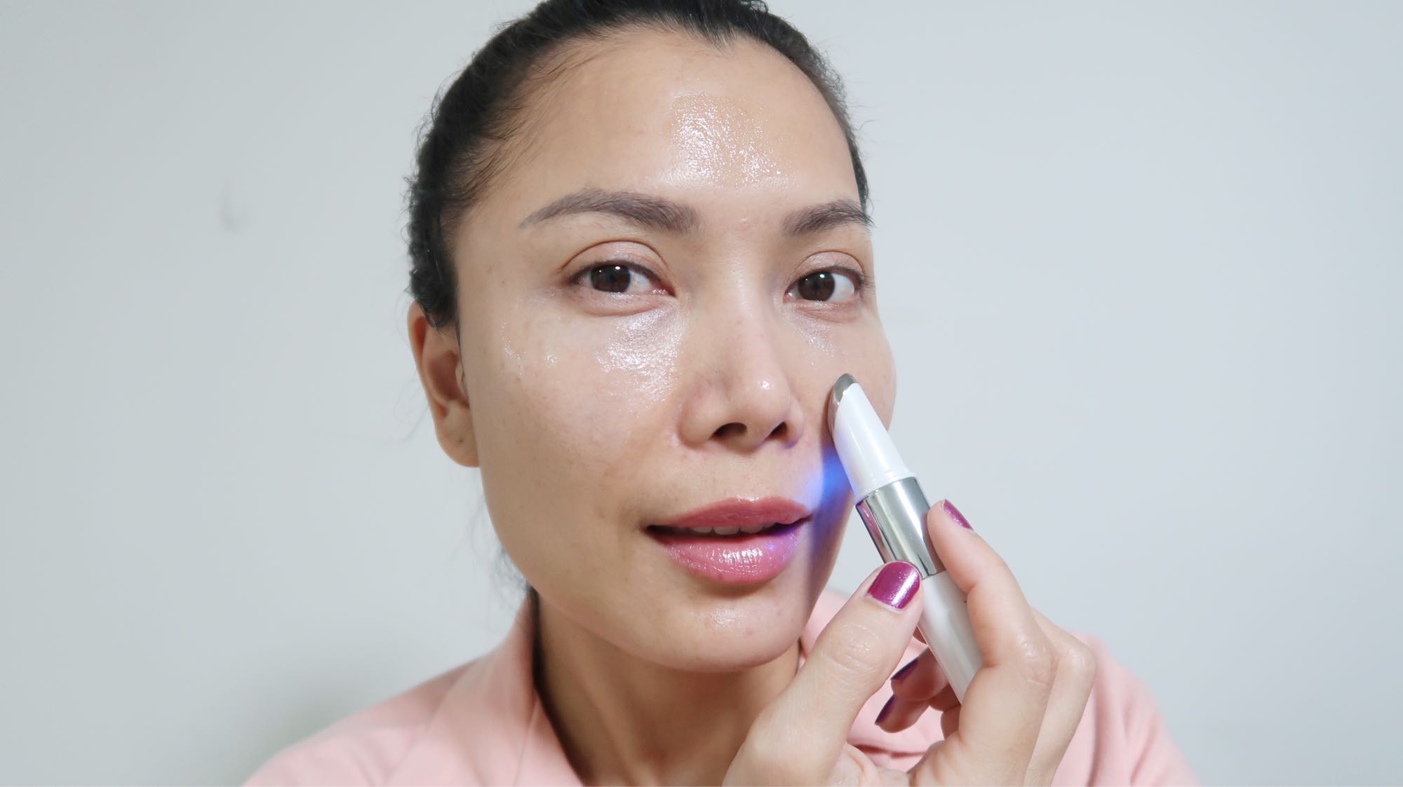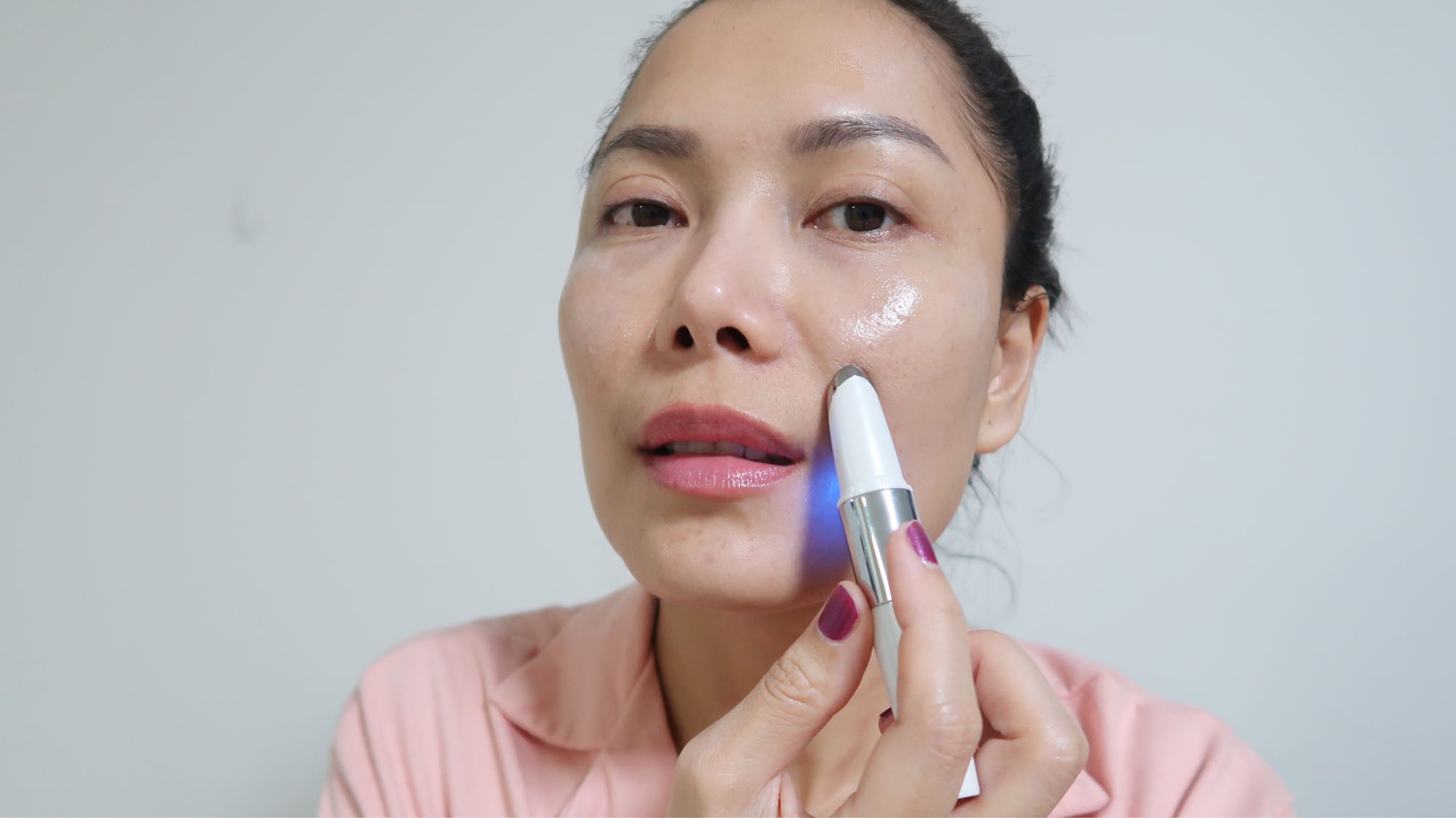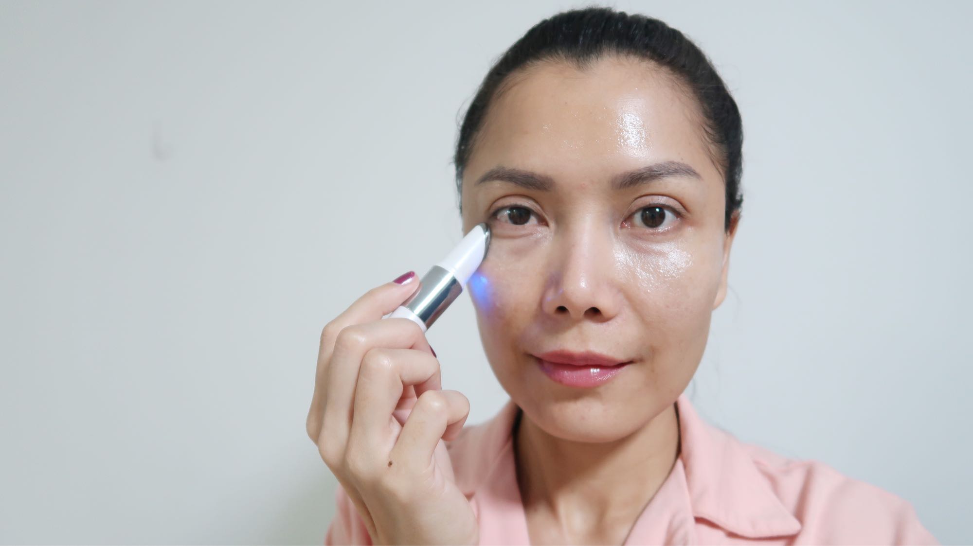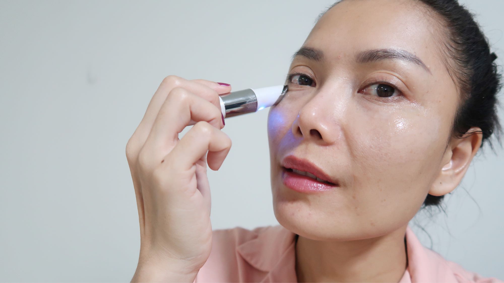 เวลานวดก็ จับเครื่องให้โดนแกนตรงกลาง และแตะปลายสัมผัสเบาๆ เริ่มจากหัวตาไปหางตา ช้าๆ และทำซ้ำ 5-8 ครั้ง ต่อข้าง รู้สึกสบาย รู้สึกว่าครีมซึมลงผิวดีมาก