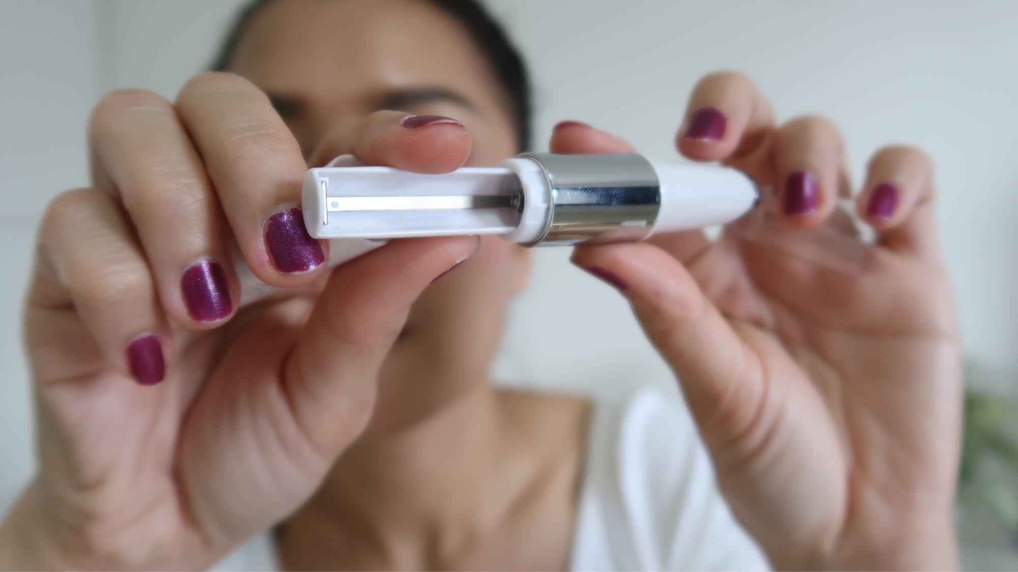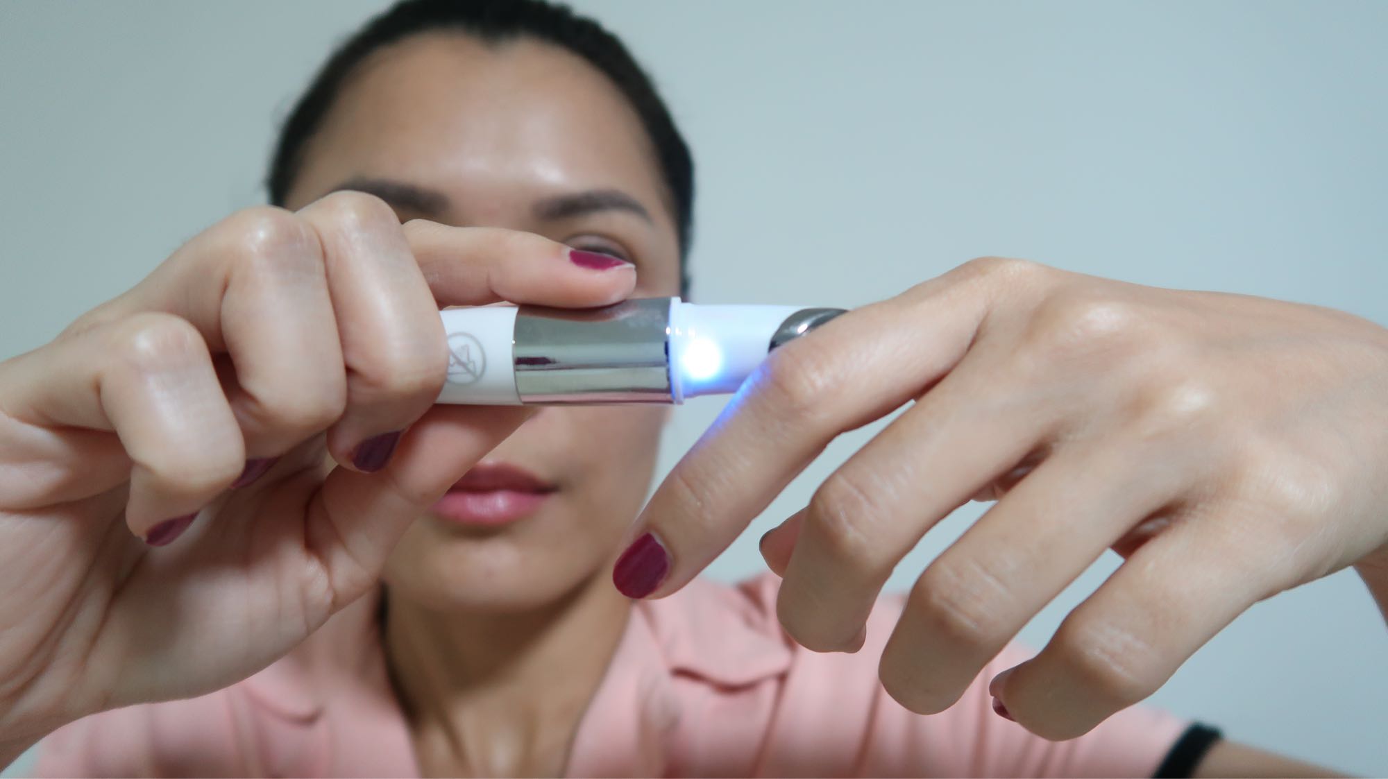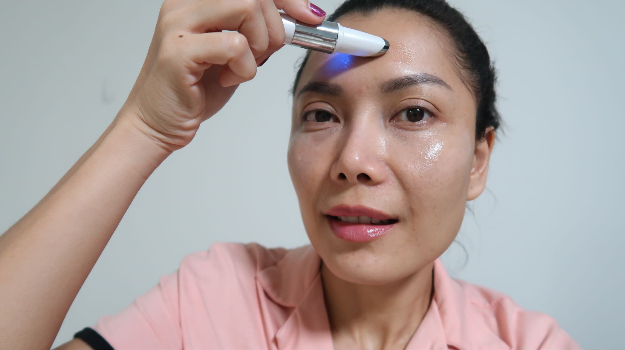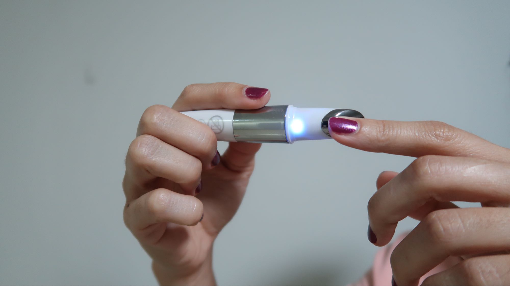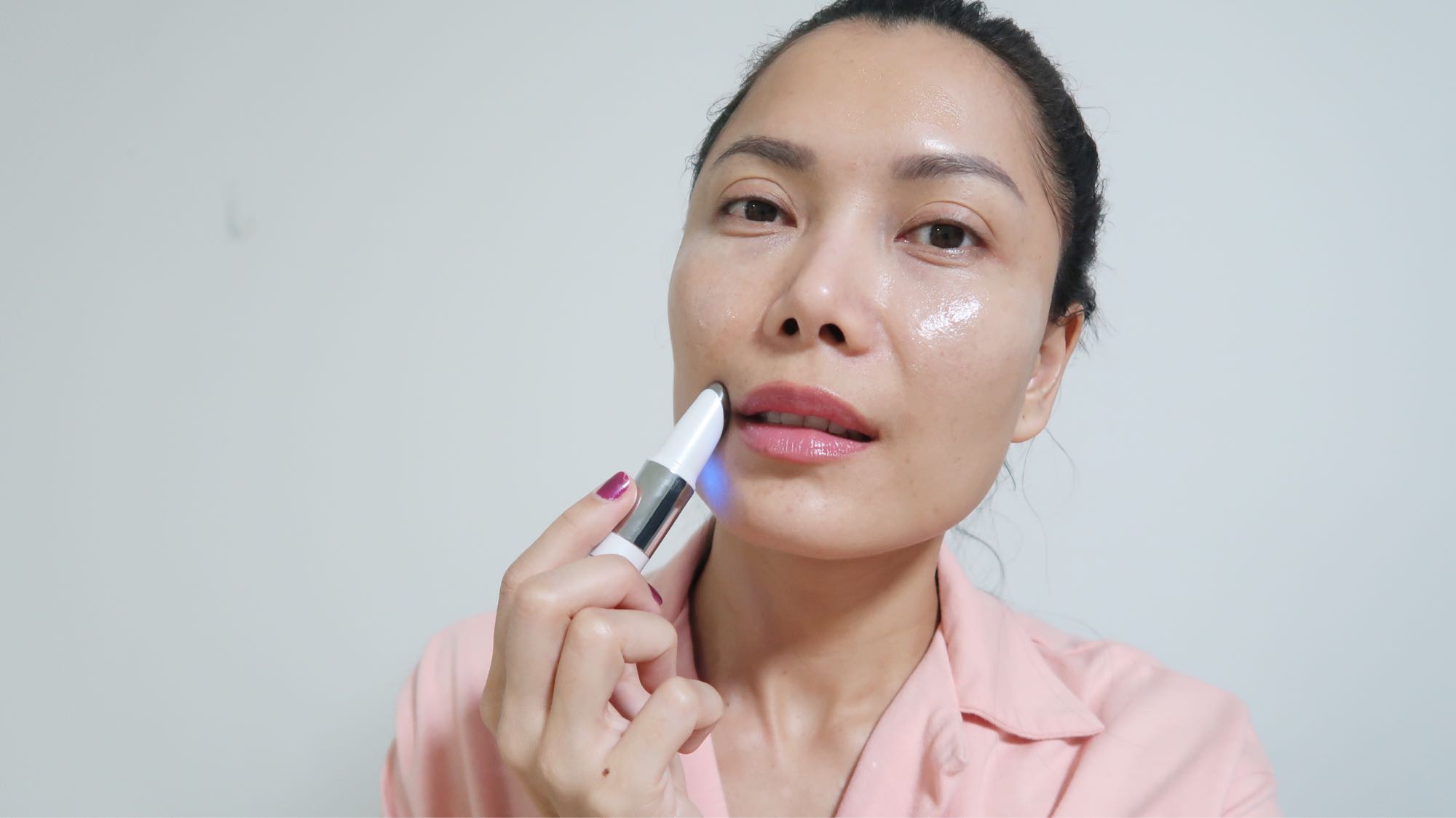 เวลานวดก็ จับเครื่องให้โดนแกนตรงกลาง และแตะปลายสัมผัสเบาๆ เริ่มจากหัวตาไปหางตา ช้าๆ และทำซ้ำ 5-8 ครั้ง ต่อข้าง รู้สึกสบาย รู้สึกว่าครีมซึมลงผิวดีมาก